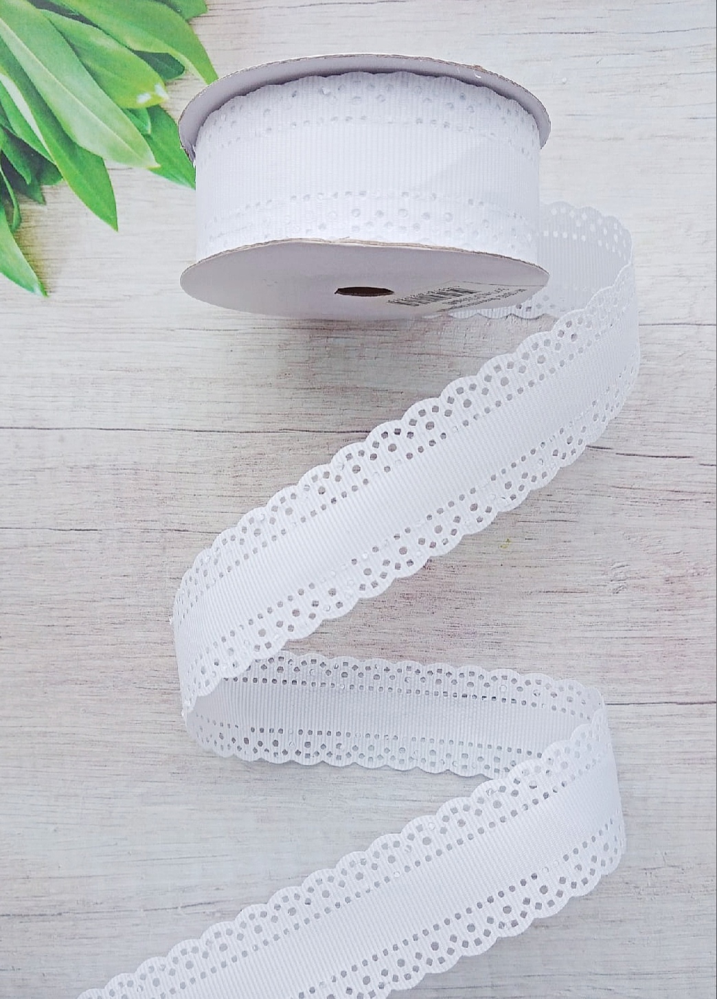 Лента репсовая с ажурными краями, цвет белый, ширина - 3 cм, длина - 4,4 м.