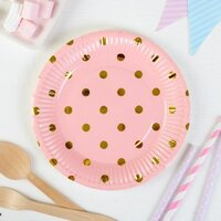 Бумажные тарелки одноразовые 18 см розовые в золотой горошек, 6 шт