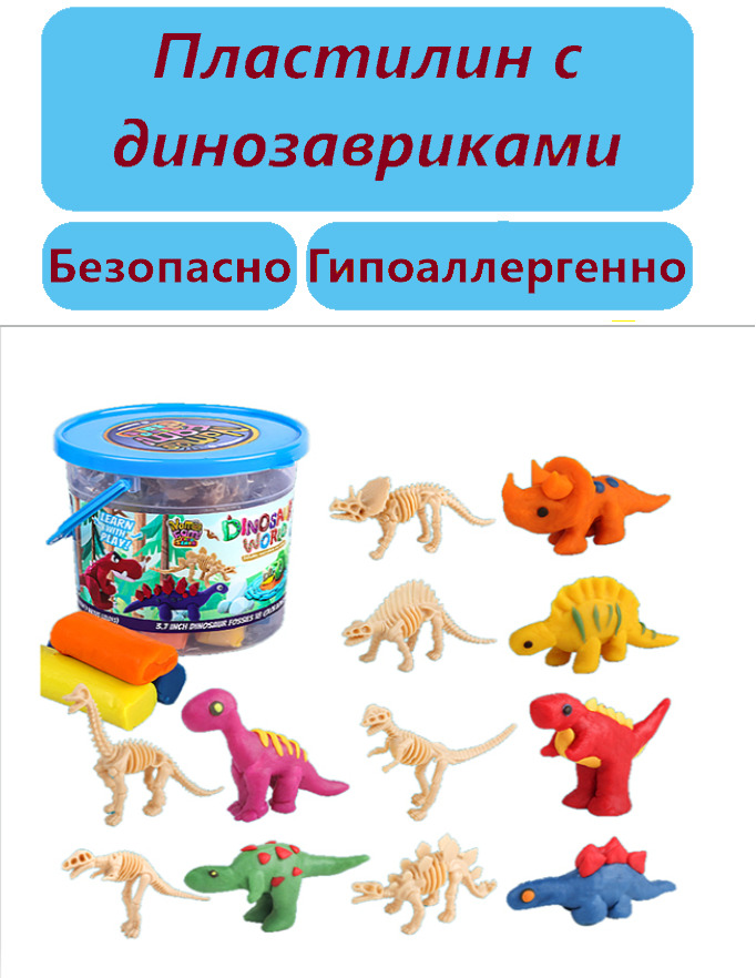 Пластилин воздушный в ведерке со скелетами динозавров мягкий 16 шт 8 цветов 6 скелетов