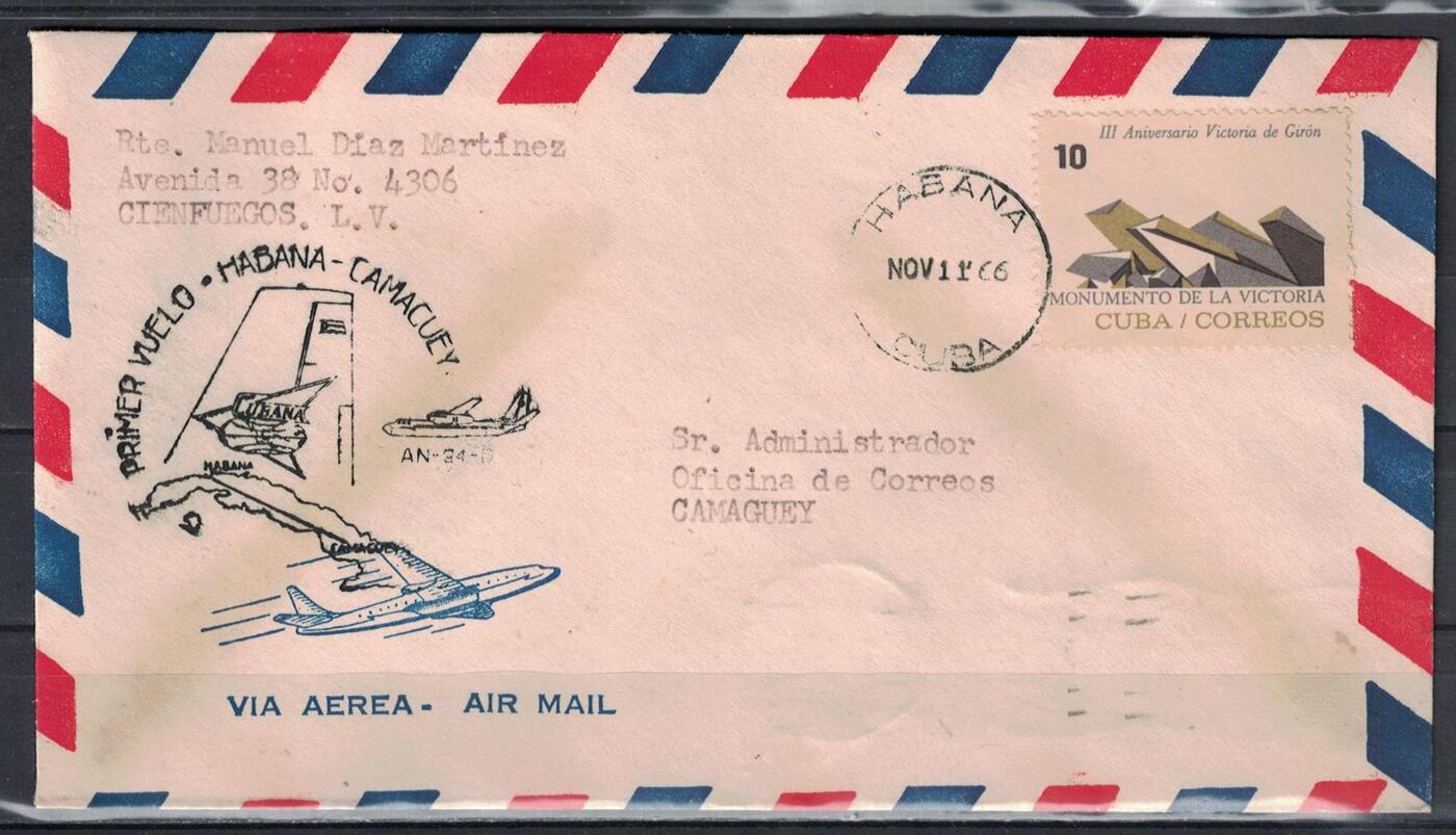 Конверт Куба 1966г. "Конверт первого рейса Гавана-Камагуэй" Самолеты