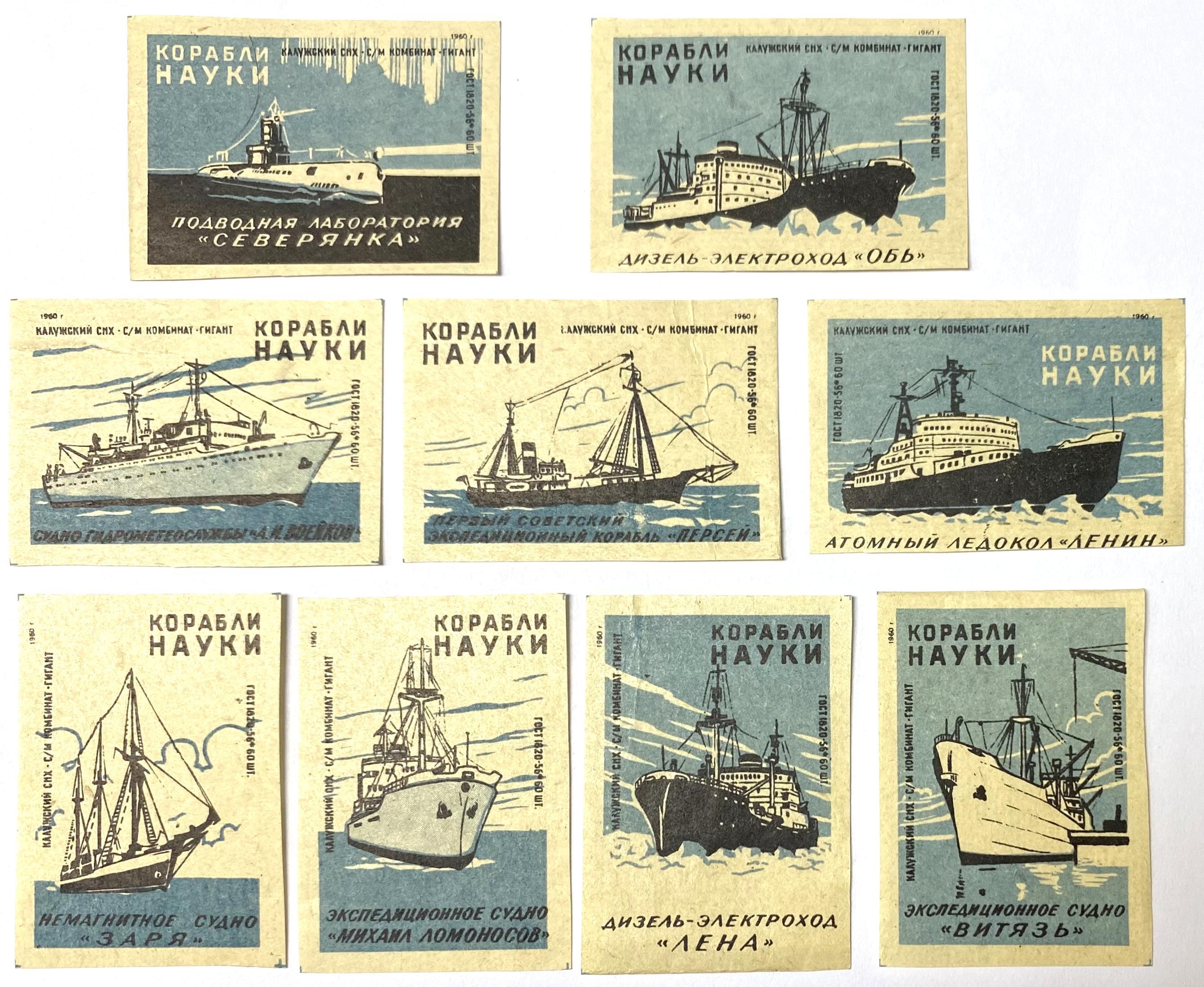Набор из 9 спичечных этикеток "Корабли науки". СССР, 1960. Комбинат "Гигант", г. Калуга.