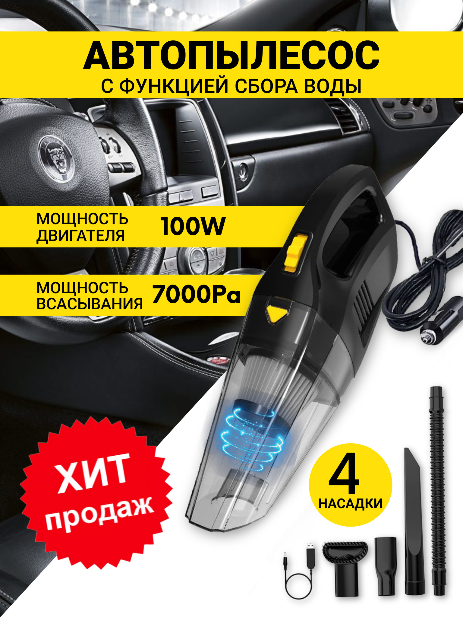 Мини-автомобильный пылесос / с проводом 5 м / со светодиодной подсветкой / с 4 насадками