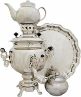 Электрический самовар рюмка 3л никелированный в наборе с подносом, чайником и сахарницей