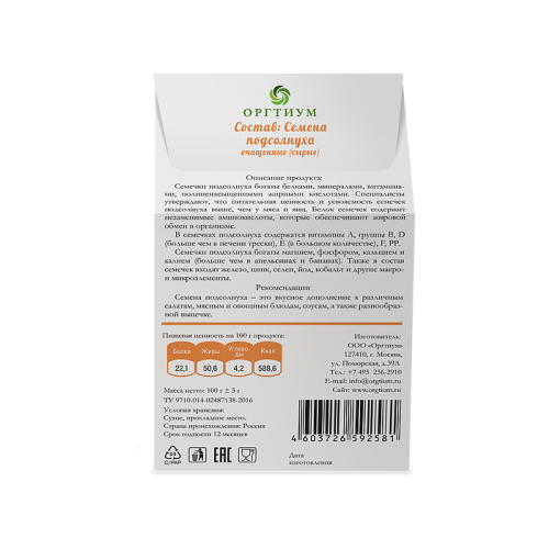Семена подсолнечника Оргтиум очищенные экологические 100 г