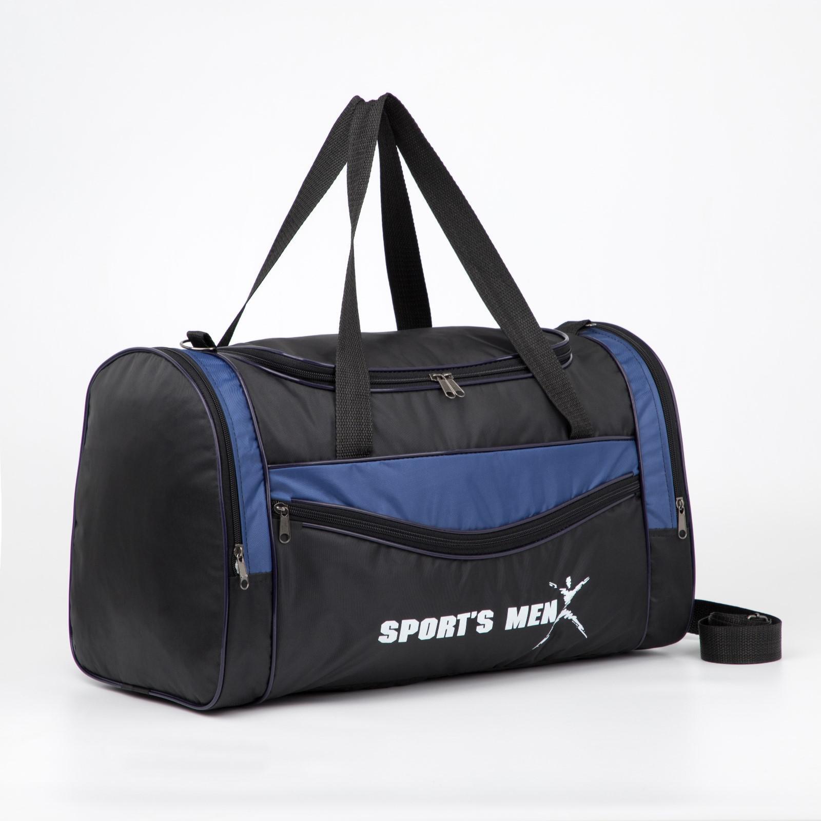 Сумка спортивная, отдел на молнии, 3 наружных кармана, длинный ремень, цвет чёрный/синий