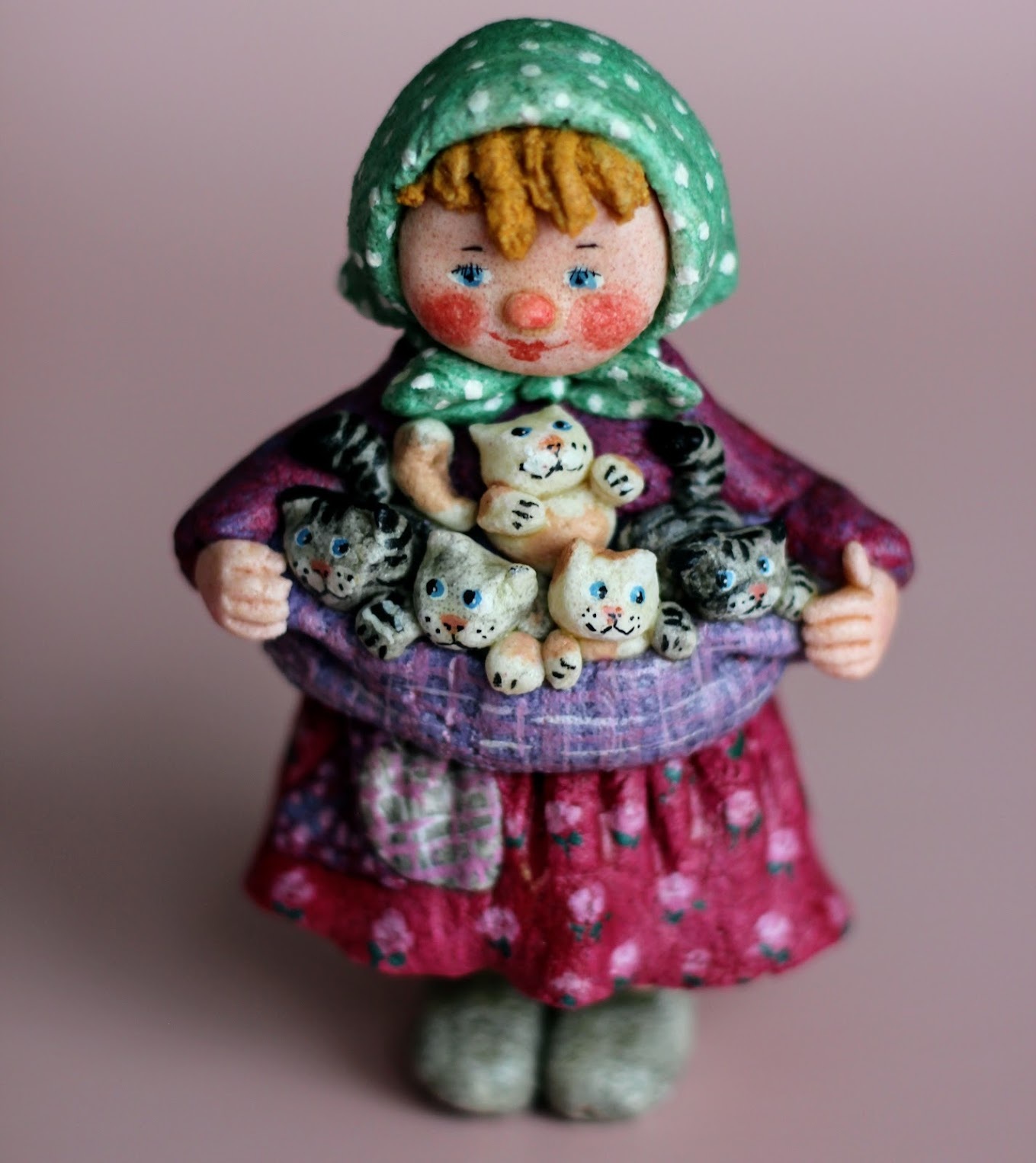 Кукла скульптура "Девочка с котятами" авторская мукосоль 8см х 6см х 11см ручная работа