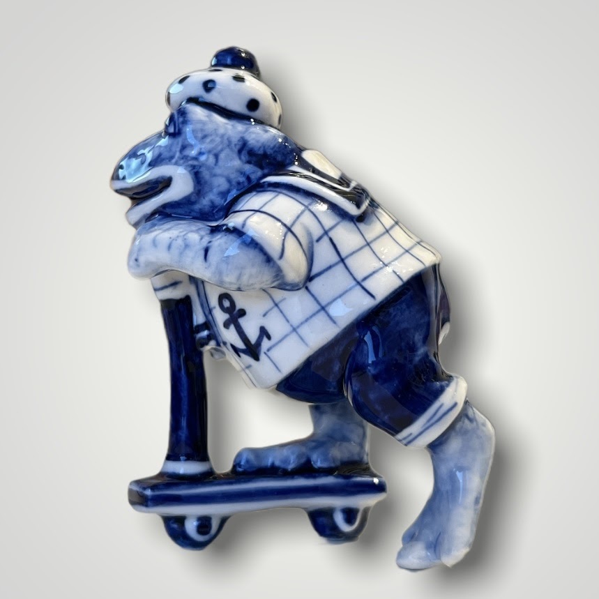 Скульптура гжель "Лягушонок на самокате" фарфор 6.5см х 5см х 9см ручная работа