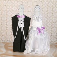 Оформление шампанского на свадьбу с синими лентами и кружевом