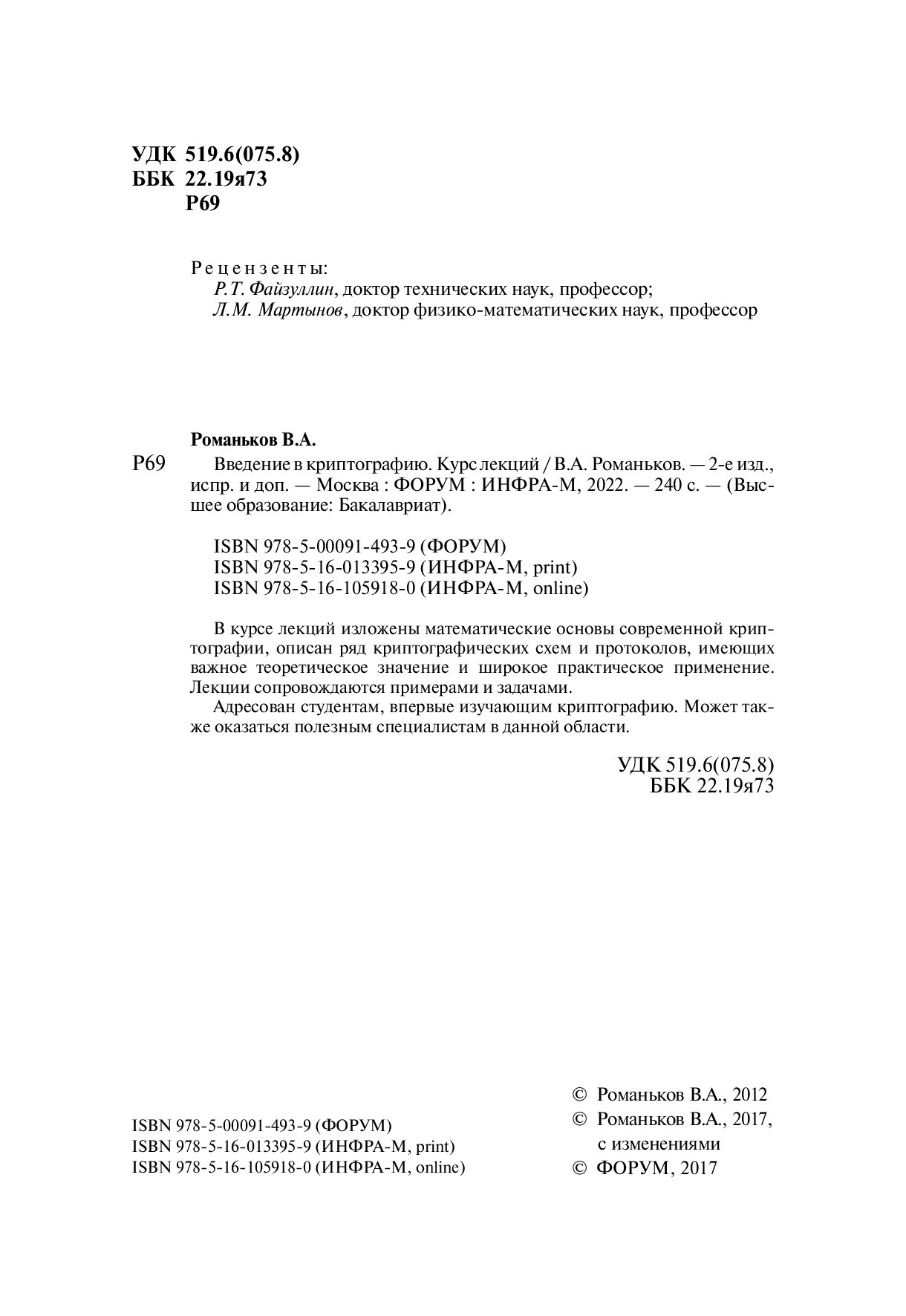 Введение в криптографию. Курс лекций. Студентам ВУЗов | Романьков Виталий Анатольевич