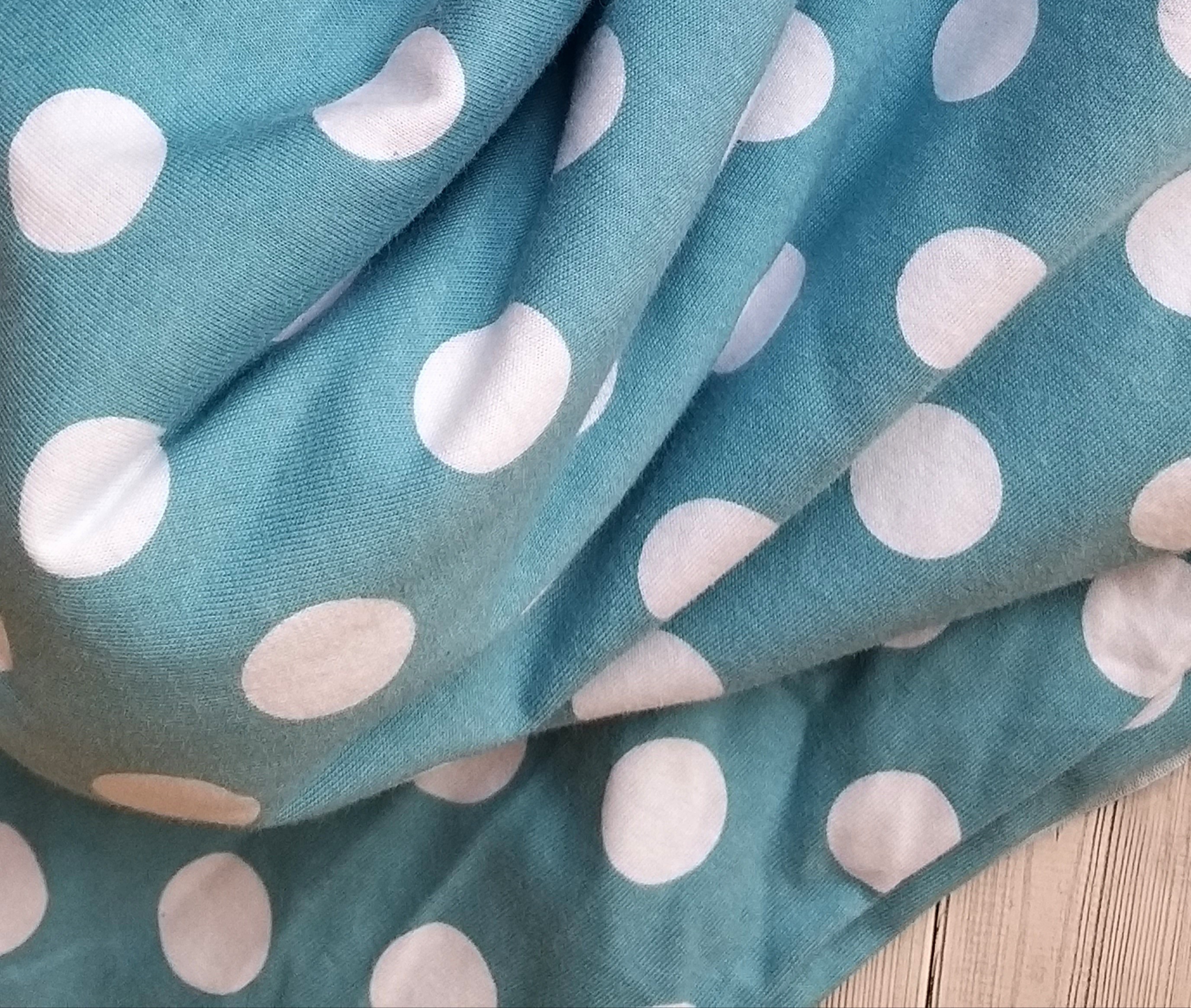 Ткань для шитья кулирка, кулирная гладь горох на голубом отрез 1,2*180