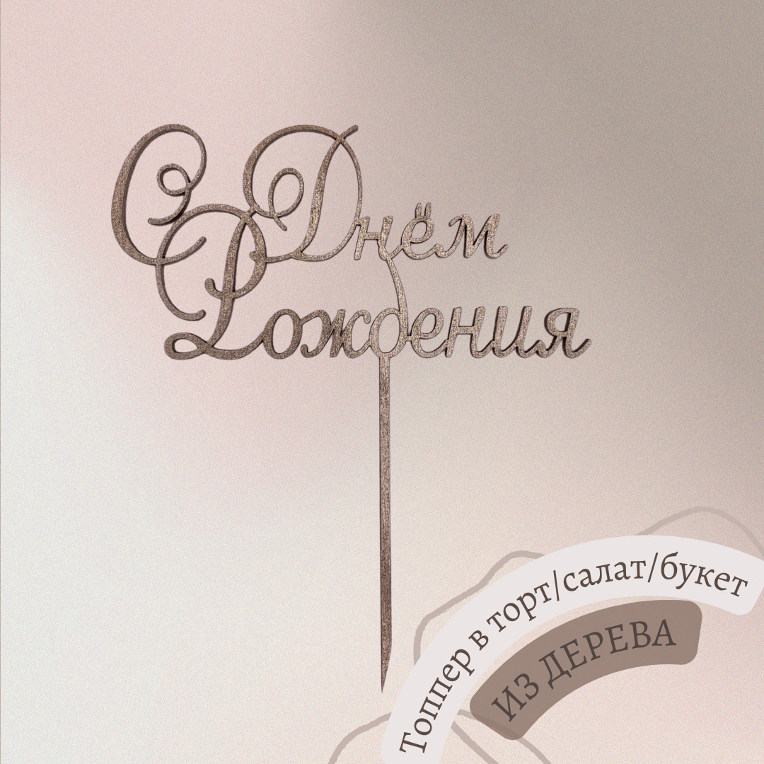 Топпер "С днём Рождения!" в торт/цветы/салат, Derevo_vo, золото