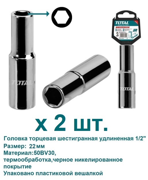 Головка торцевая шестигранная удлиненная 1/2" TOTAL 22мм, 2 шт.