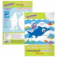 Картон белый А4 мелованный, 10 листов, в папке, юнландия, 200х290 мм, "юнландик И рыбки", 129569