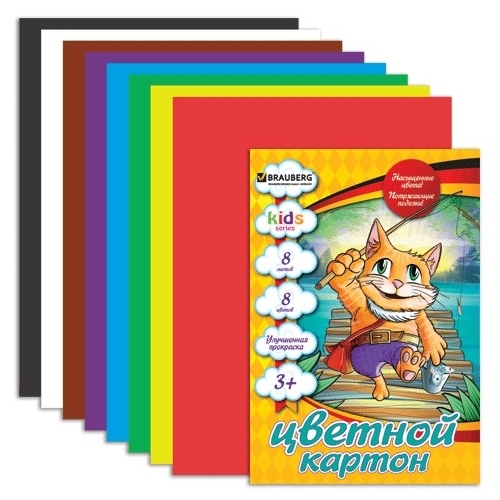 Цветной картон Кот-рыболов Kids Series BRAUBERG, A4, 8 л., 8 цв.