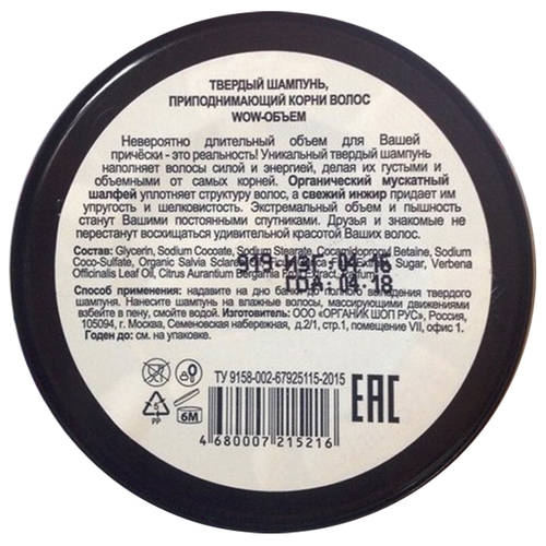 Твердый шампунь Organic Shop Organic Kitchen приподнимающий корни волос Wow-объем, 100мл