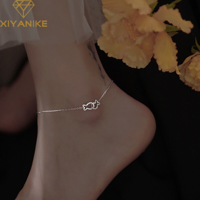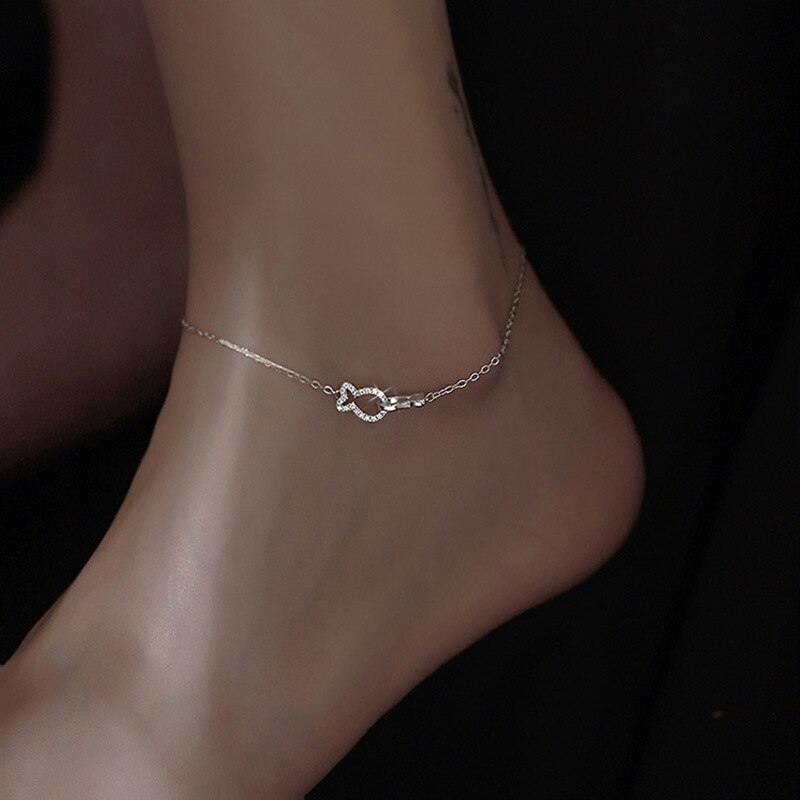 Браслет на ногу женский из серебра 925 пробы с поцелующимися рыбками