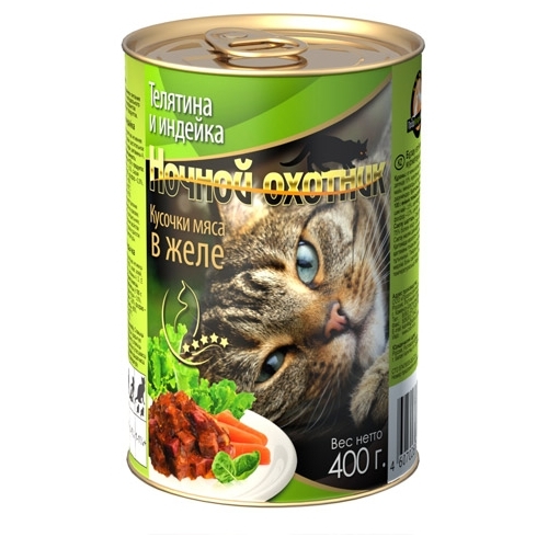 Корм для кошек Ночной охотник Кусочки мяса в желе Телятина и Индейка