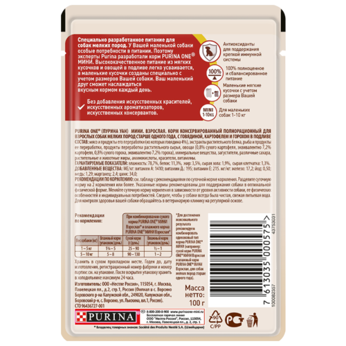 Корм для собак Purina ONE МИНИ Взрослая с Говядиной, картофелем и горохом в подливе