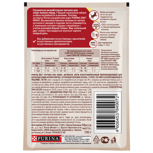 Корм для собак Purina ONE МИНИ Активная с Уткой, пастой и зеленой фасолью в подливе