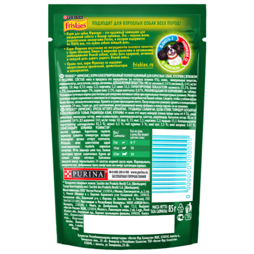 Корм для собак Friskies (0.085 кг) 1 шт. консервированный полнорационный для взрослых собак, кусочки с ягненком в подливе
