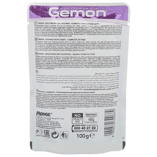 Корм для кошек Gemon Кусочки с индейкой. Влажный корм для пожилых кошек