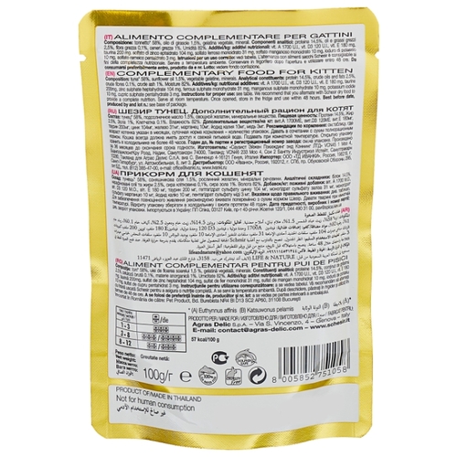 Корм для котят Schesir беззерновой, с тунцом 20шт. х 100 г (кусочки в желе)