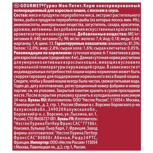 Корм для кошек Gourmet Мон Петит беззерновой, с лососем 30шт. х 50 г (кусочки в соусе)