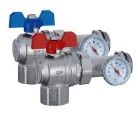 Угловой шаровый кран TIM 1"х1" с термометром (пара: красная и синяя бабочка), арт. M309-4