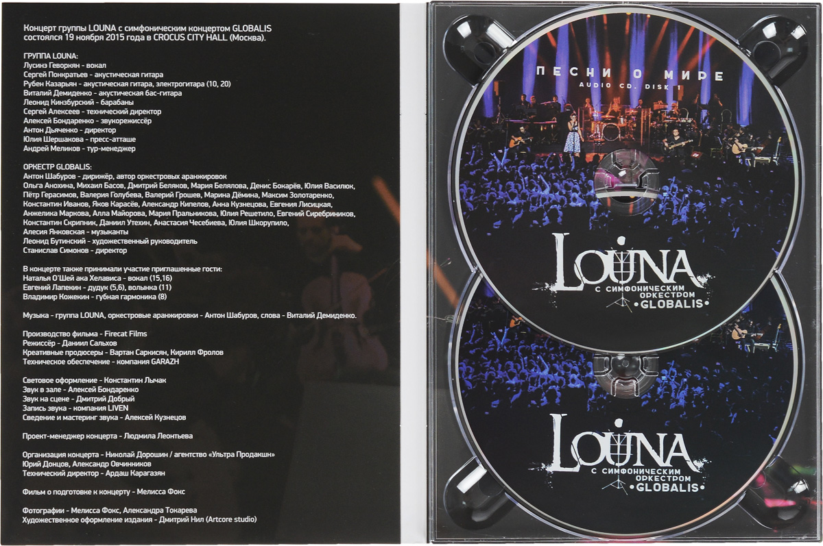 Bonus DVD 1 "Louna с симфоническим оркестром "Globalis". Песни о мире" содержит: 01. Оркестровая увертюра 02. Зачем? 03. Путь к себе 04. Кто, если не мы? 05. Солнце 06. Сожжённая заживо 07. Вендетта 08. Штурмуя небеса 09. Словно Форрест Гамп 10