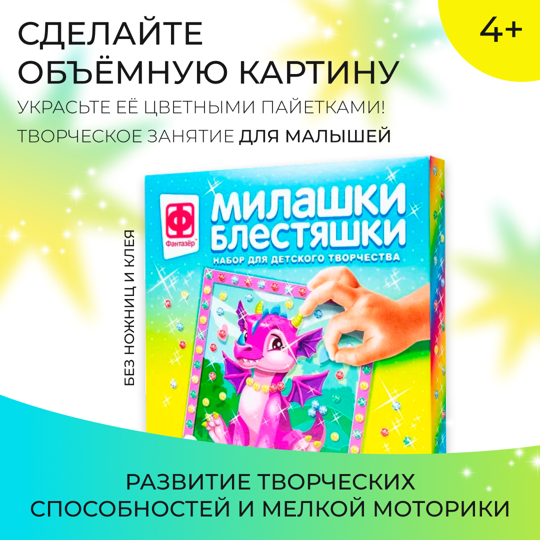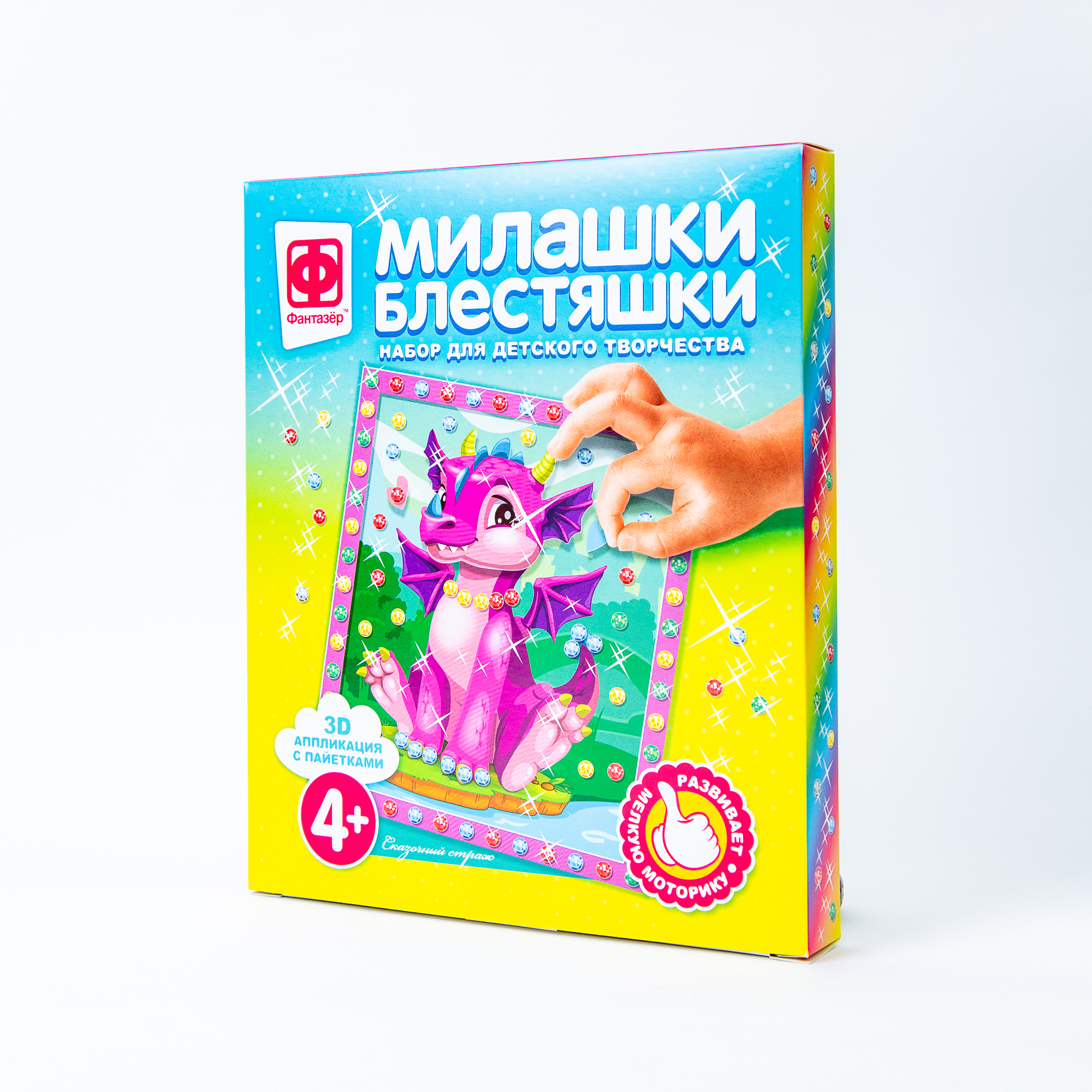 Развивающий набор “МИЛАШКИ-БЛЕСТЯШКИ” объединяет сразу несколько любимых детских занятий. Сначала нужно создать объёмную аппликацию, подбирая и наклеивая фигурные детали, а потом украсить её блестящими пайетками. Работа с блестками отлично развивает мелку