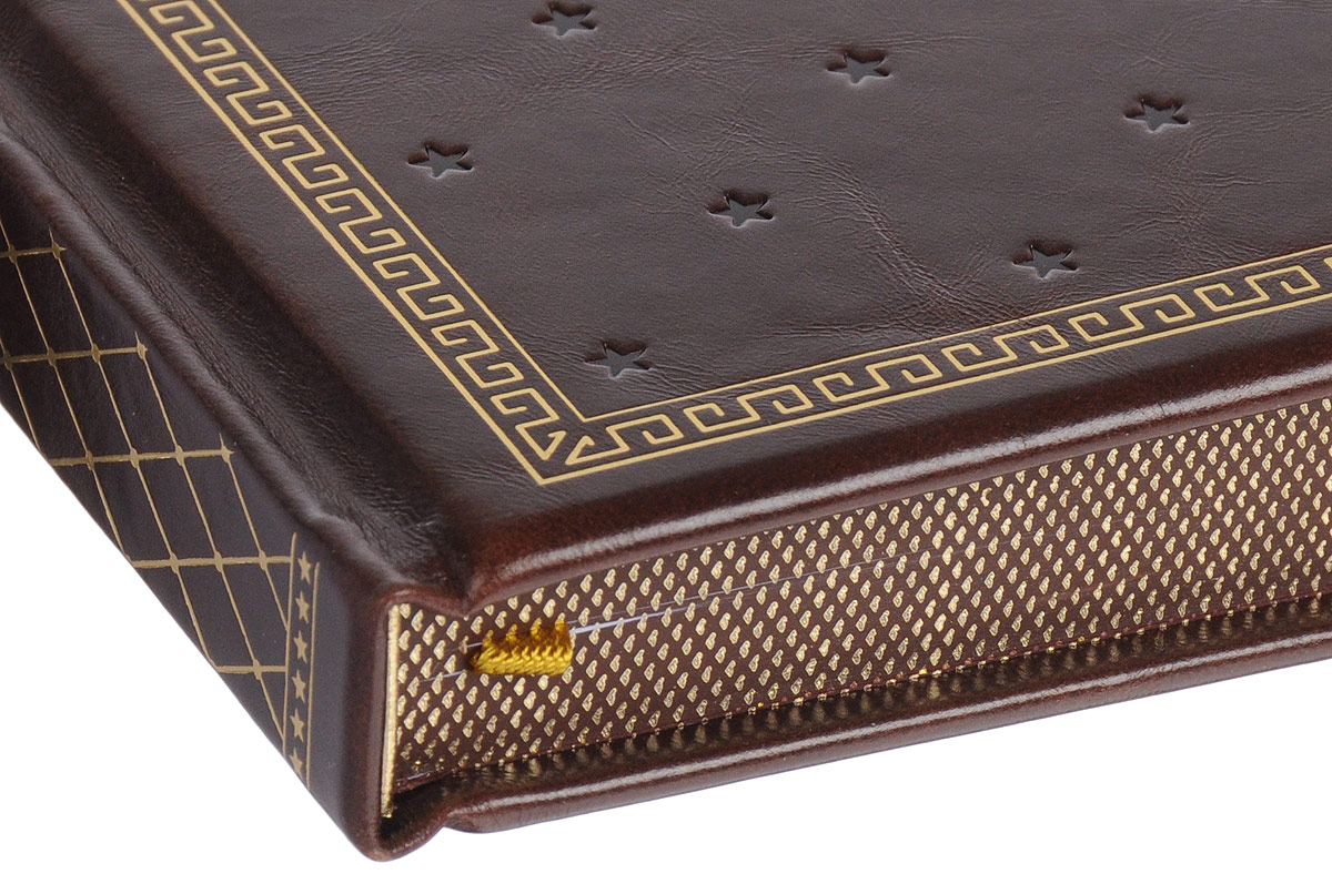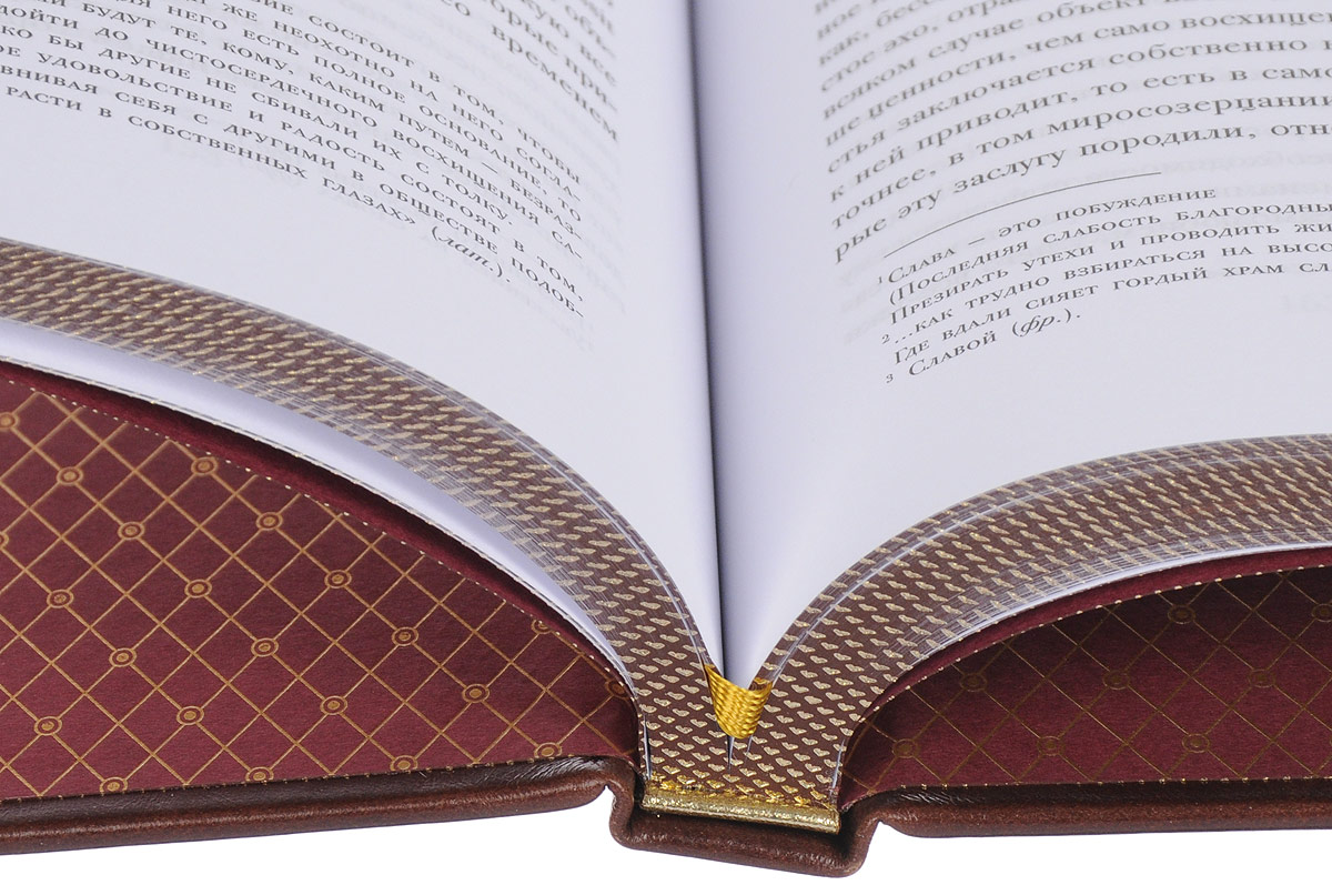 Эксклюзивное подарочное издание в переплете ручной работы из натуральной кожи с блинтовым и золотым тиснением. Бинтовой корешок, золотой каптал, шелковое ляссе. Трехсторонний крашенный и торшонированный золотом обрез. Форзацы выполнены из дизайнерской бум