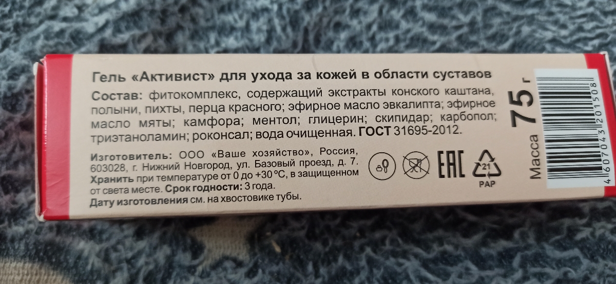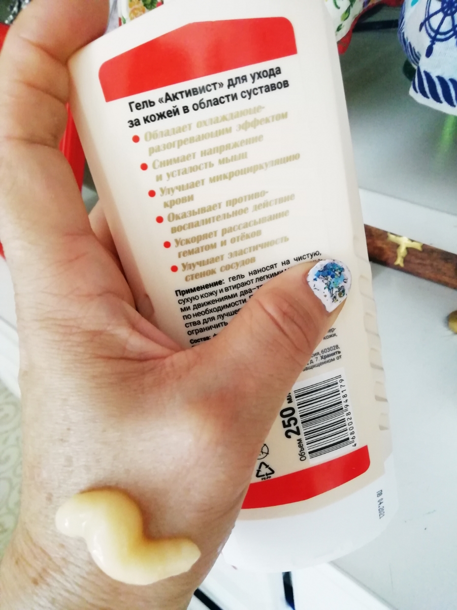 Состав:Фитокомплекс, содержащий экстракты конского каштана, полыни, пихты, перца красного, эфирное масло эвкалипта, мяты, камфора, ментол. Описание:Гель «Активист» для ухода за кожей в области суставов. - Обладает охлаждающе-разогревающим эффектом - Снима