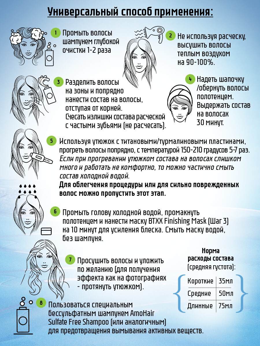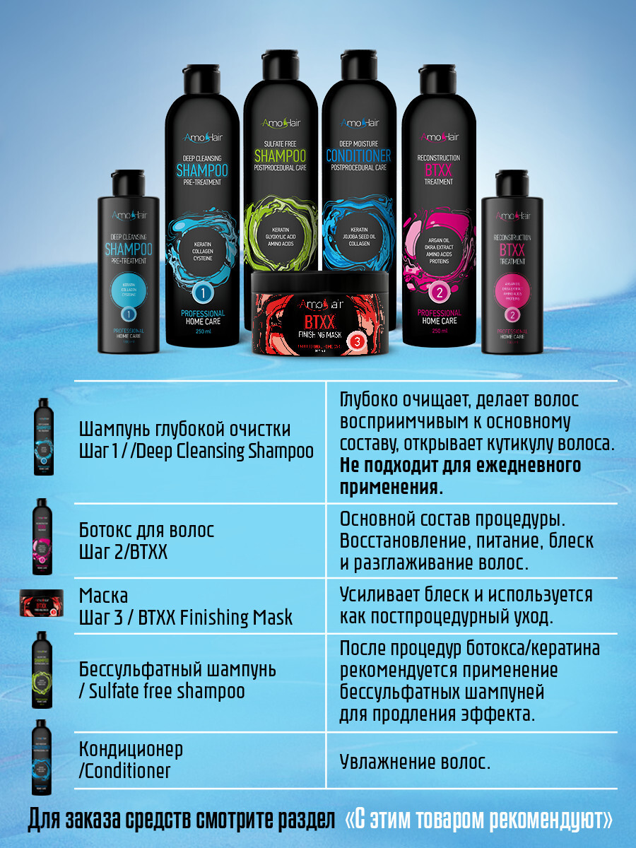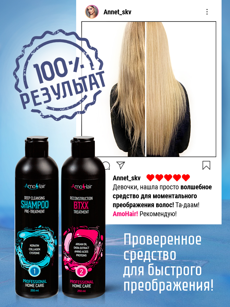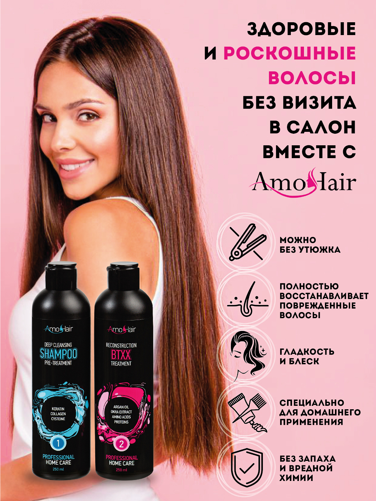 Ботокс для волос AmoHair BTXX идеален для домашнего применения. Набор состоит из двух средств, сочетающих в себе 1 и 2 шаг ухода за поврежденными волосами. Ботокс для волос с кератином не содержит формальдегид (безопасен, не жжет слизистую). Холодный бото