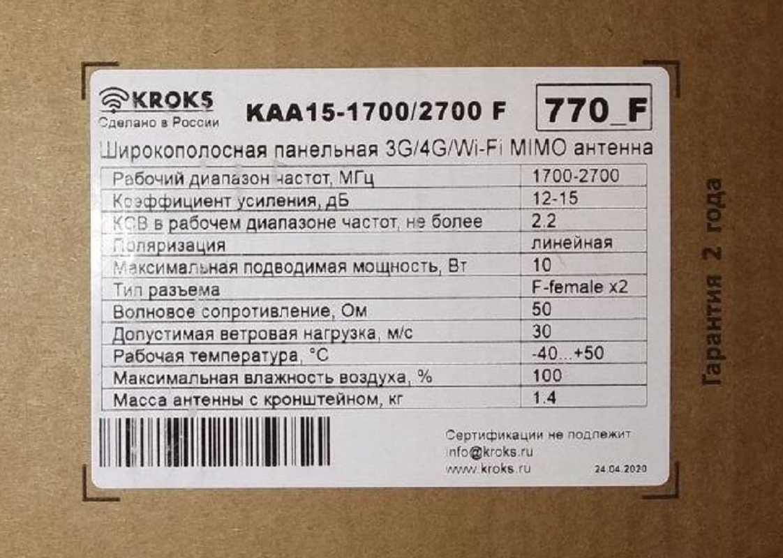 Характеристики:Поляризация - ЛинейнаяВходное сопротивление - Ом 75Максимальная подводимая мощность, Вт - 10Разъём - F- femaleДопустимая ветровая нагрузка м/с - 30Диапазон рабочих температур, оС -40 ... +80Максимально допустимая влажность воздуха, % - 100К
