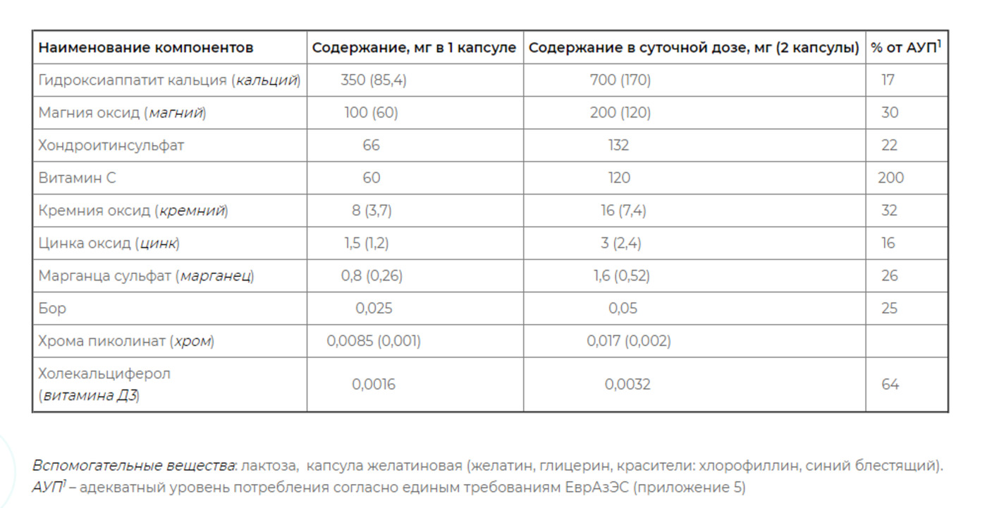 Состав:Кальция гидроксиаппатит, магния оксид, хондроитинсульфат, витамин С, лактоза (молочный сахар), кремния оксид, тальк (антислеживатель), цинка оксид, марганца сульфат, бора глицират, хрома пиколинат, витамин D3, капсула желатиновая (желатин, глицерин
