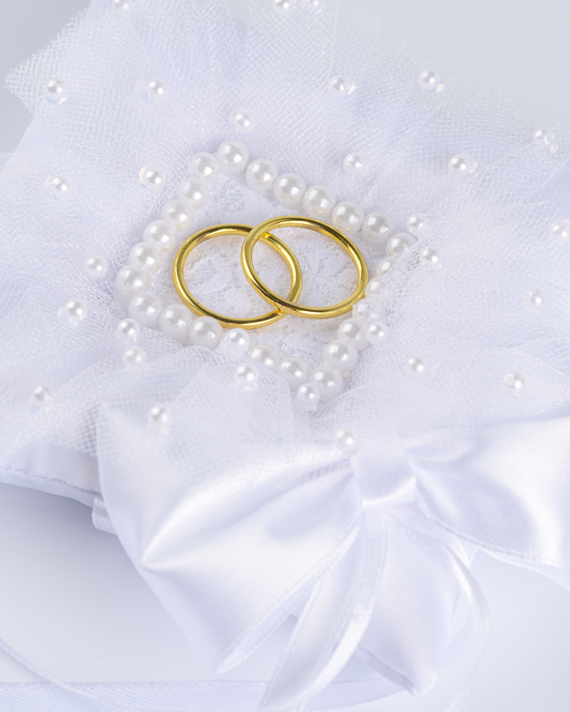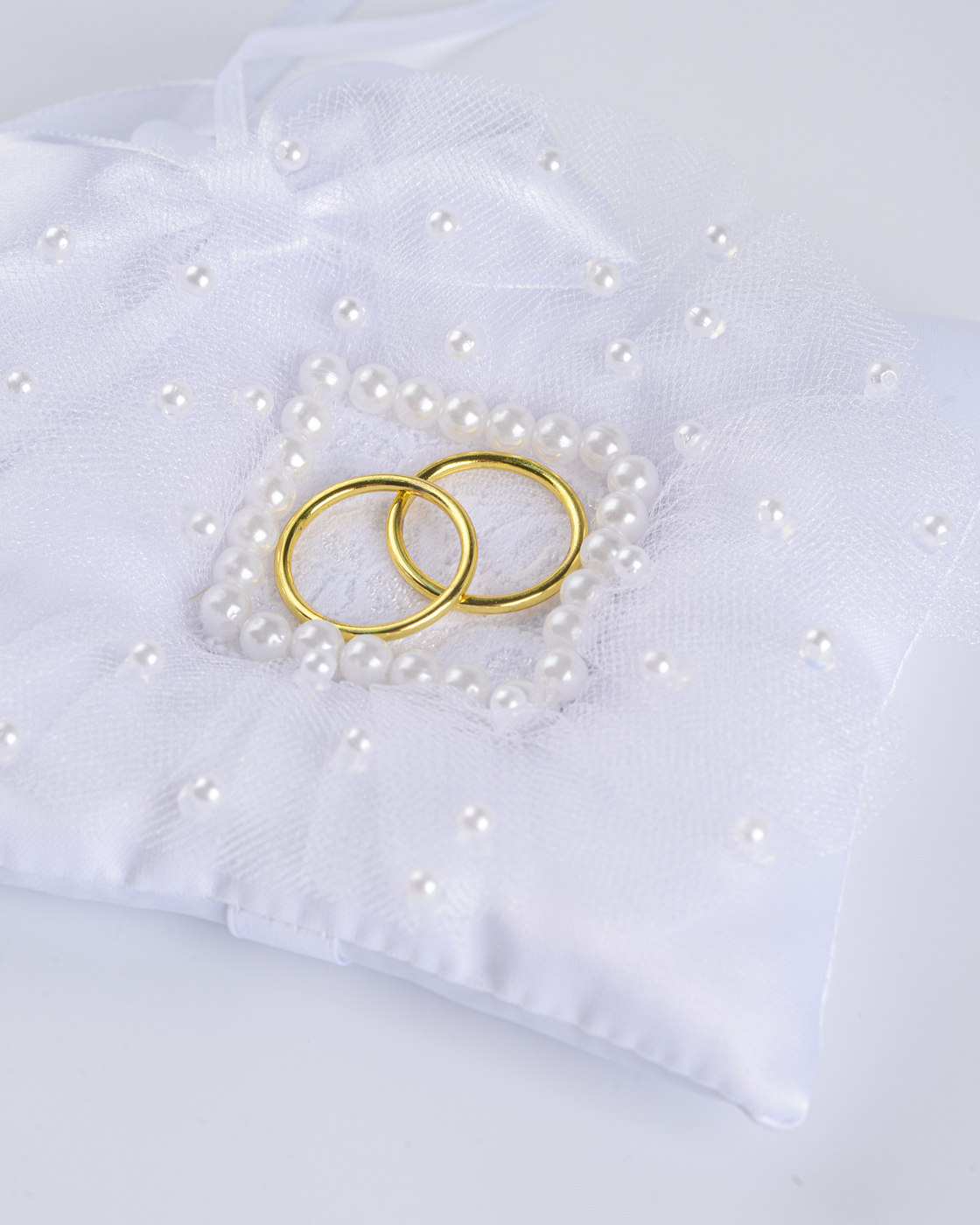 Подушечка для колец из коллекции "Рандеву" с нежным фатином и бусинами станет романтичным дополнением для ваших обручальных колец! Подушечка вручную изготовлена из белоснежного матового атласа, украшена фатином, кружевом, атласным бантиком и жемчужными бу