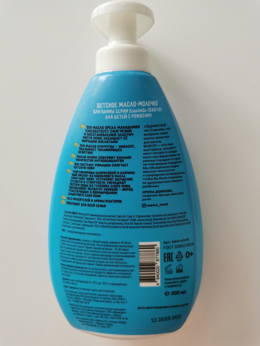 Состав:(INCI): Mineral Oil, Caprylic Capric Triglycerides* (эмолент из кокосового масла), Isopropyl Palmitate* (эмолент) , PEG-40 Sorbitan Рeroleate* (ПАВ, эмульгатор), Macadamia Ternifolia Seed Oil* (масло макадамии), Zea Mays Oil* (масло кукурузное), Ol