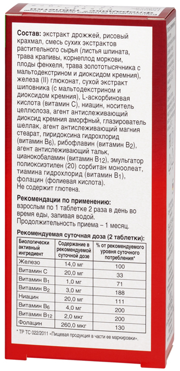 Состав:Экстракт дрожжей, смесь сухих экстрактов растительного сырья (листья шпината, трава крапивы, корнеплод моркови, плоды фенхеля, трава золототысячника с мальтодекстрином и диоксидом кремния), железо (II) глюконат, сухой экстракт шиповника (с мальтоде