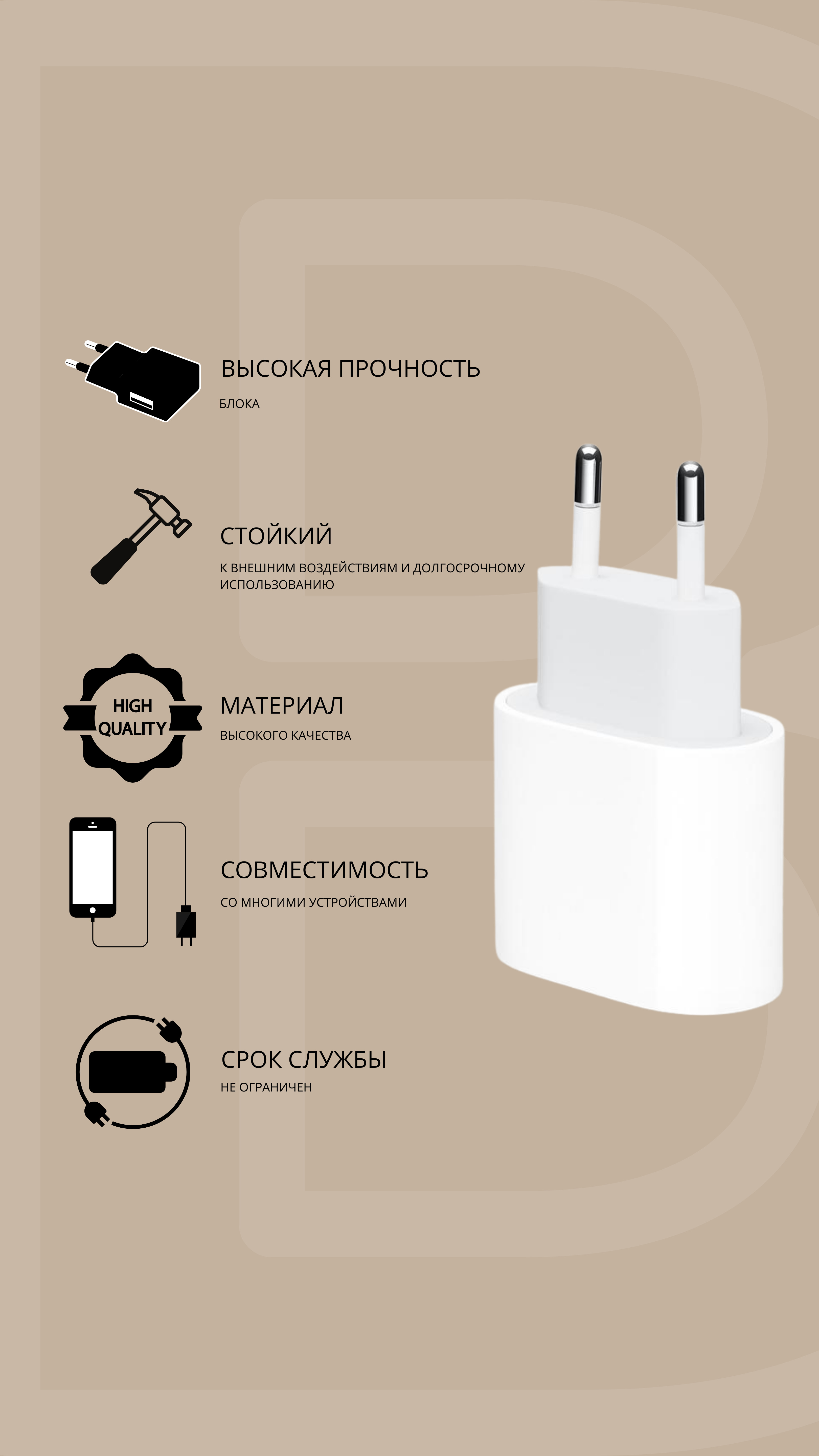 Комплектация:Сетевое зарядное устройство - 1 шт.Кабеля в комплекте НЕТ!Список совместимых устройств:Все модели линейки iPhone.Зарядное устройство для iPhone 5/5S, 6/6S, 6 Plus/6S Plus, 7/8, 7Plus/8Plus, iPhone X/XS, XR, XS Max, iPhone 11, 11 Pro, 11 Pro