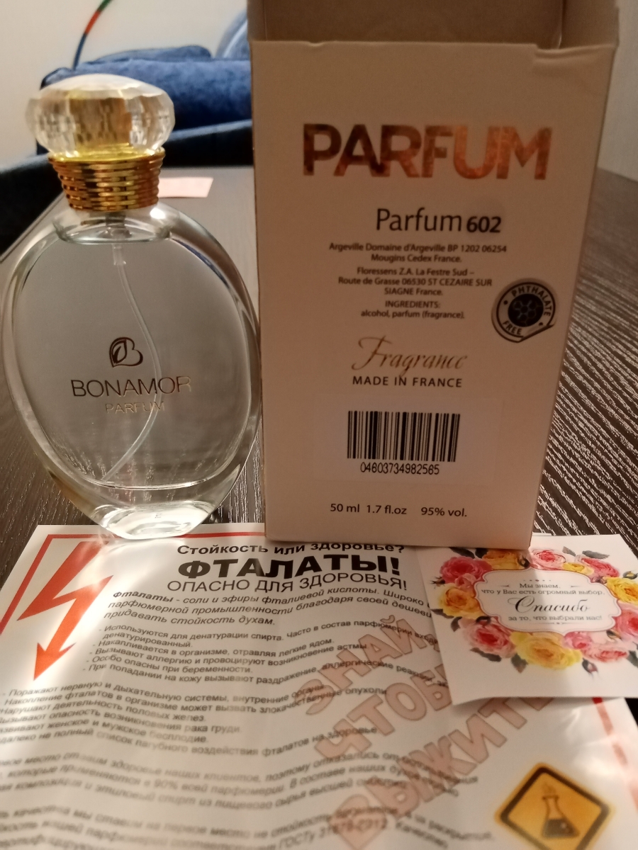 Состав:Спирт этиловый ректификованный из пищевого сырья, парфюмерная композиция Франция.Описание:Аромат BONAMOR for women 602 - Вся хрупкость женщины отражается в этом легком, как перышко, чистом и прозрачном аромате.Это не копия и не аналог. За основу бе