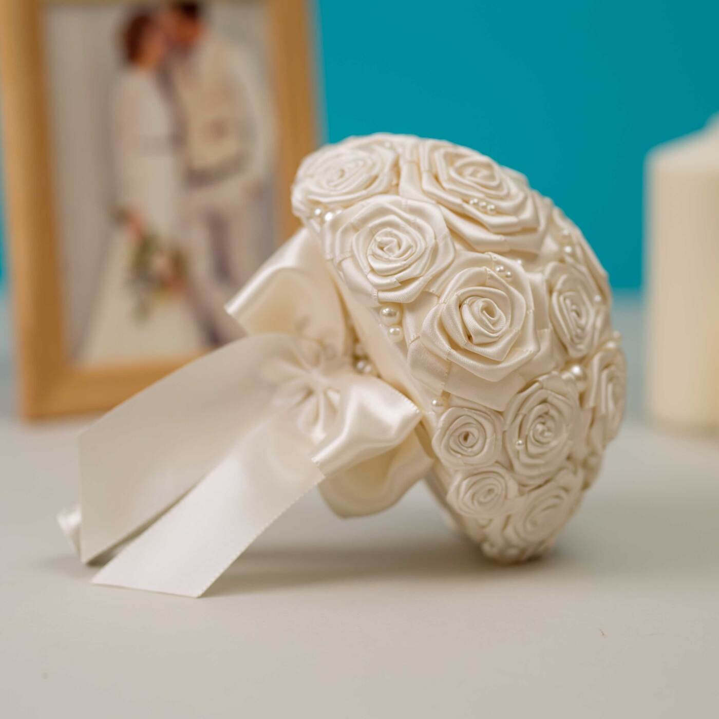 Комплектация:1 букет невестыОписание:Букет-дублер для невесты из коллекции "Портофино" станет волшебной деталью образа новобрачной! Букет вручную собран из нежных роз, изготовленных из атласа цвета айвори, декорирован двусторонней атласной лентой, жемчужн
