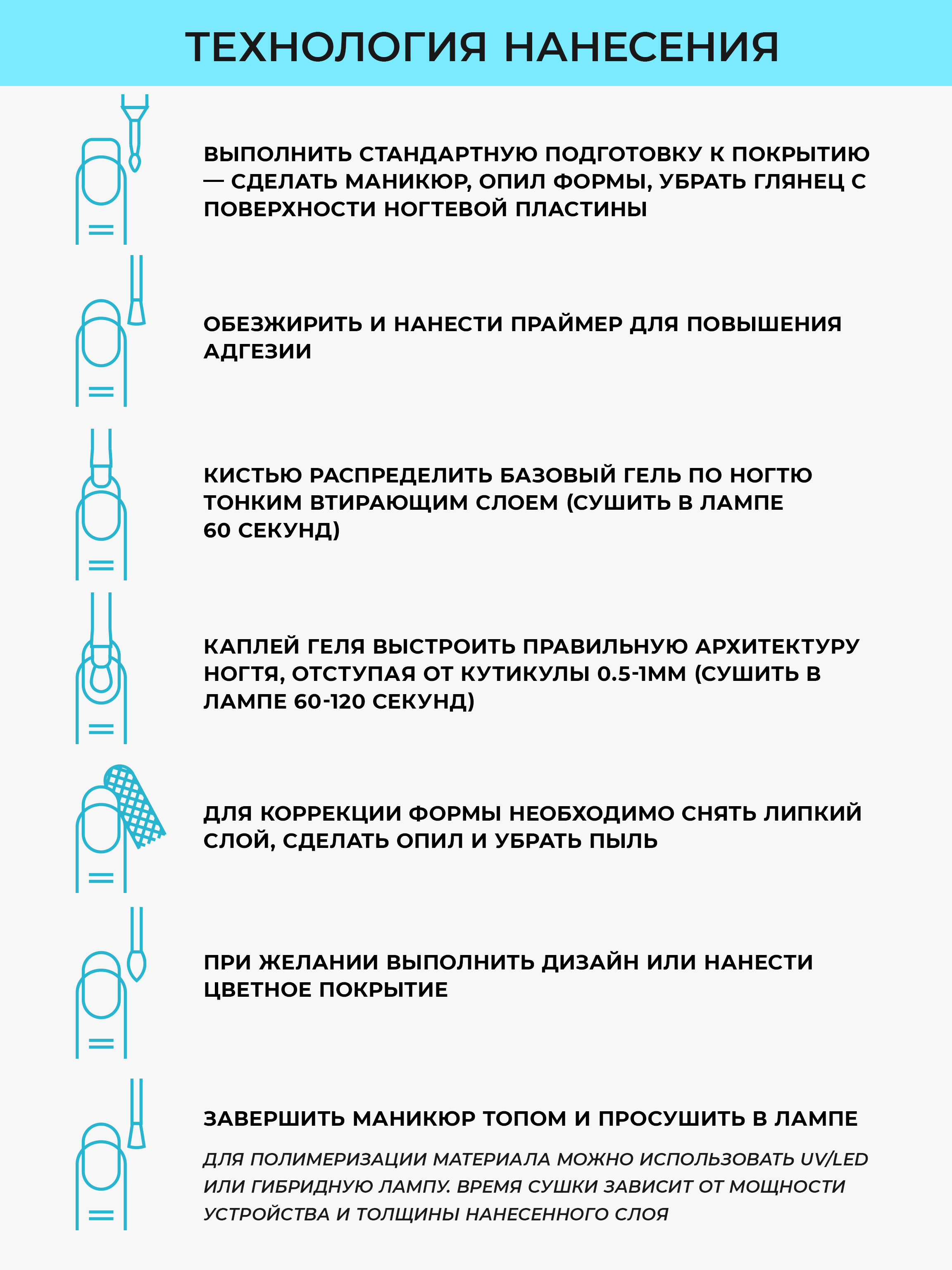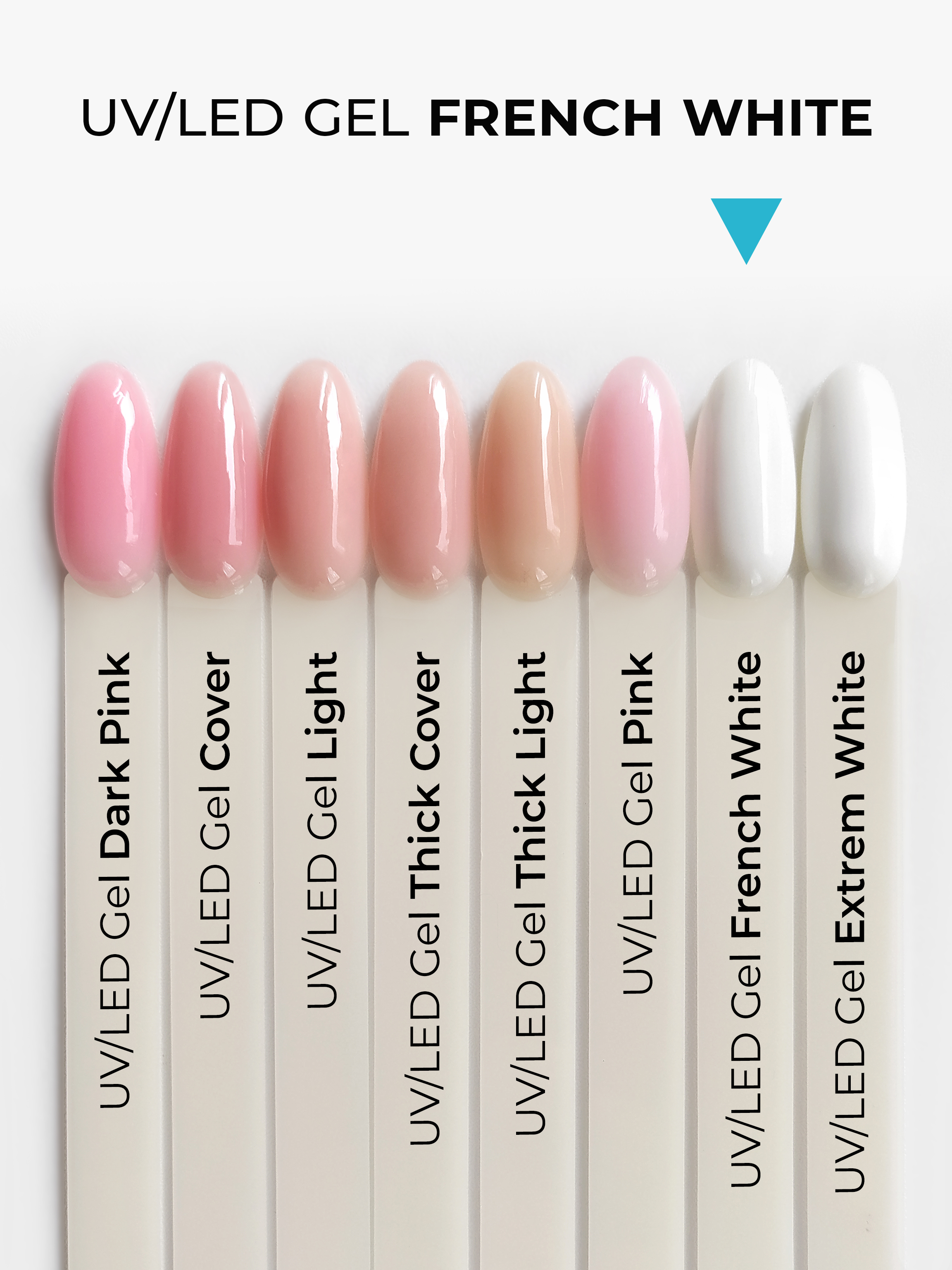 Белый гель для создания «французского маникюра» в выкладной технике. Предназначен для работы на формах. Не течет, не желтеет после полимеризации. Материал легко выкладывается, самовыравнивается, средняя вязкость позволяет создать четкую линию улыбки. Гель