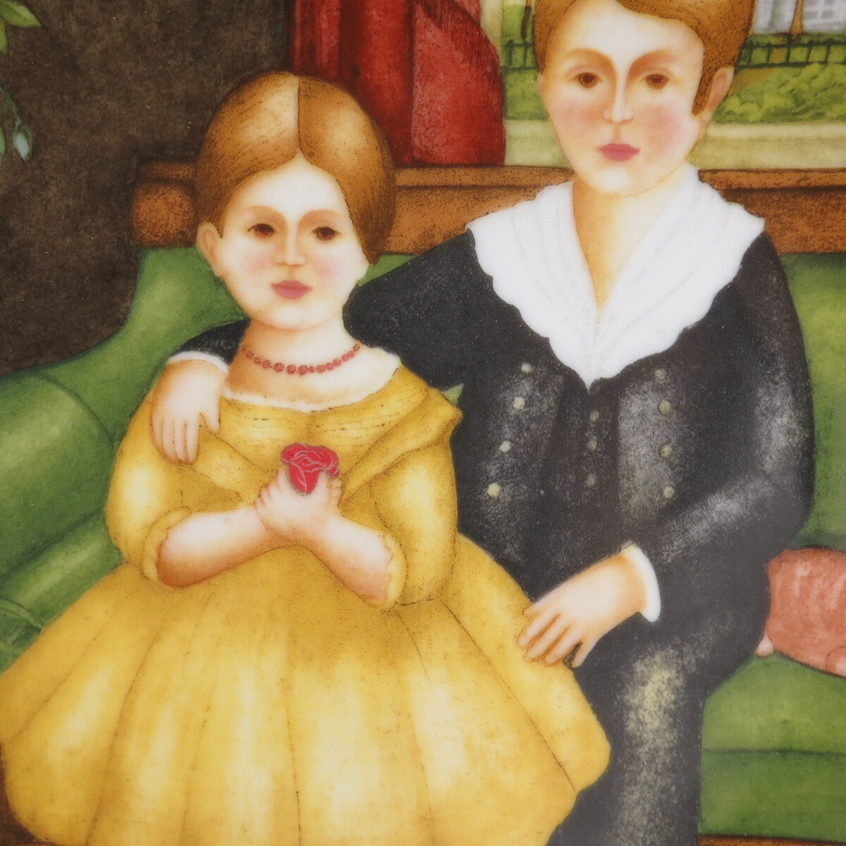 Декоративная коллекционная фарфоровая тарелка из серии "Невинность Америки. Национальные Художники". Работа художников Барбары Марстен и Валентина Мандраджи. Изображает девочку и мальчика в гостинной на диване, рядом лежит кошка. Тарелка пронумерованная у