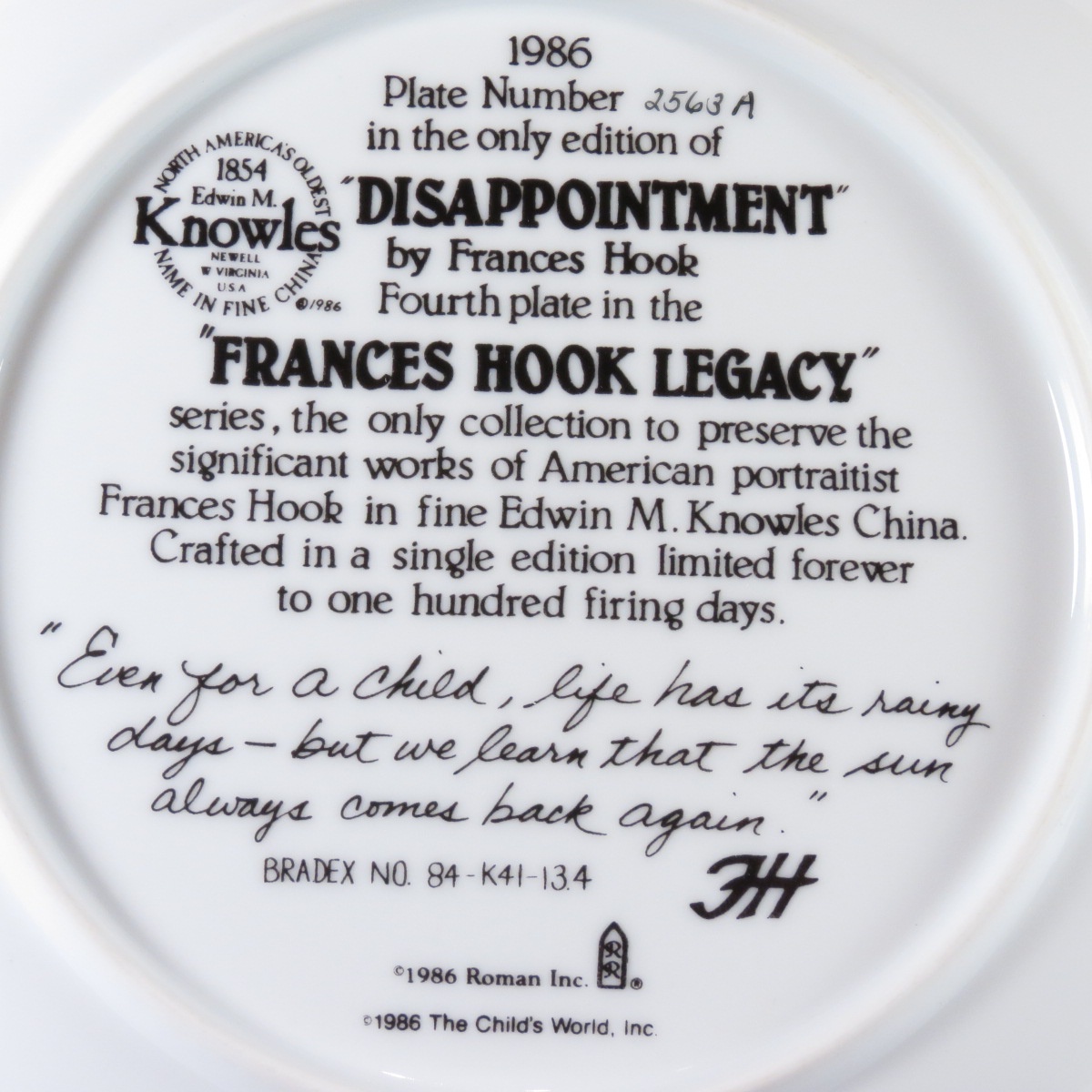 Декоративная коллекционная фарфоровая тарелка из серии "Френсис Хук: Наследие" по рисункам художницы Френсис Хук.Тарелка пронумерованная уникальным номером, а сама серия ограничена по времени выпуска.Название тарелки - Разочарование.Фирма производ