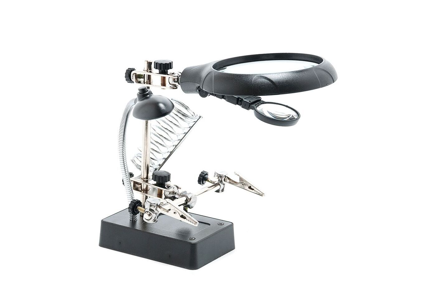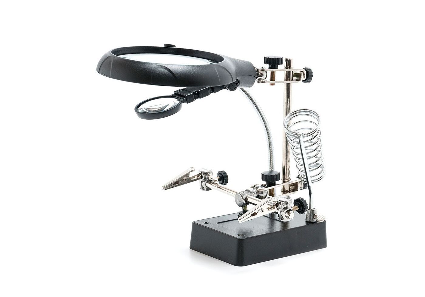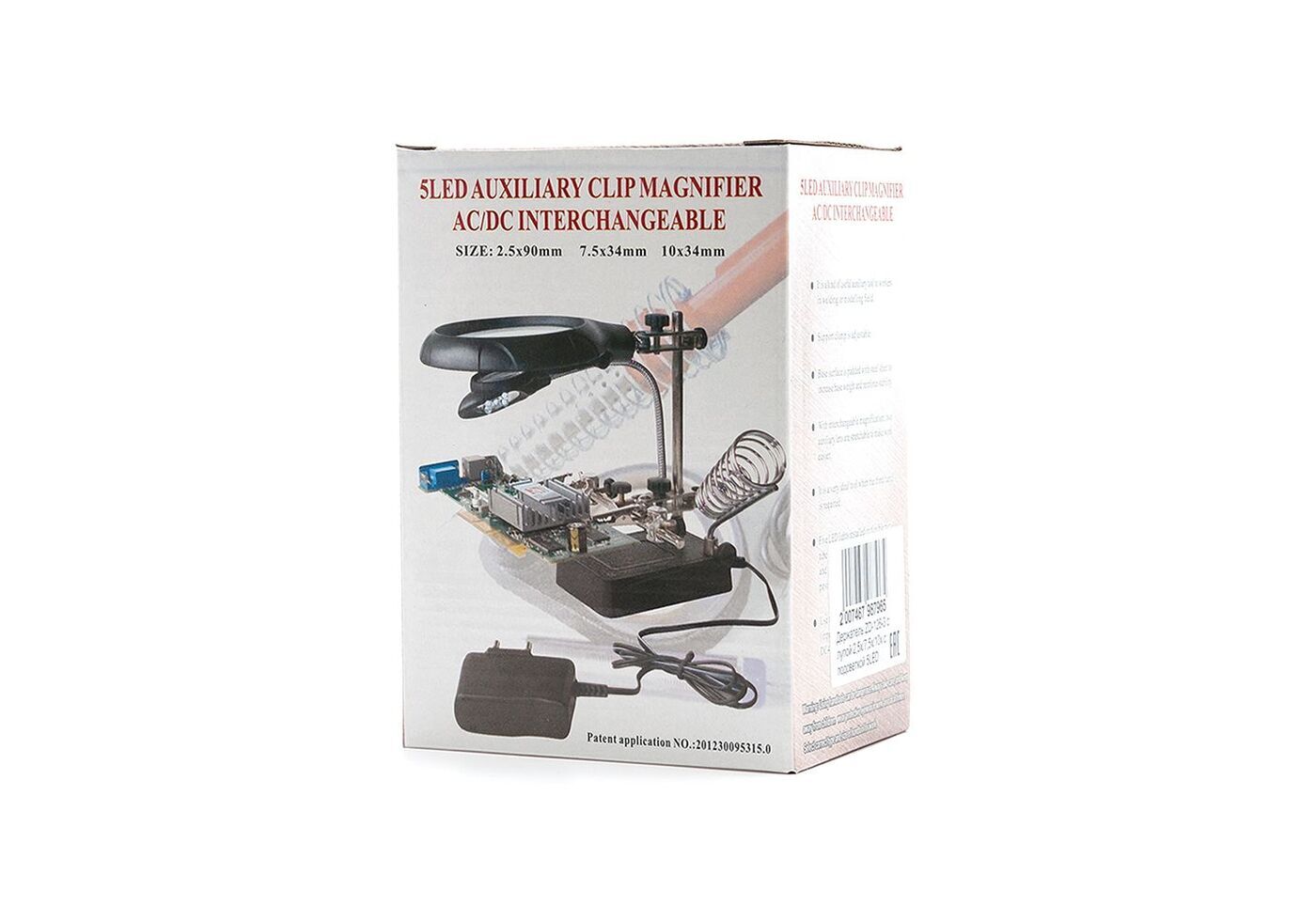 Удобный держатель для плат с лупой и светодиодной подсветкой.Оснащен устойчивым основанием с зажимами-крокодилами и подставкой под паяльник.Увеличение лупы: Ø90мм х 2,5Х Ø34мм х 7,5Х Ø34мм х 10ХПодсветка 5LED на гибком штативе, работает от сети 220В.
