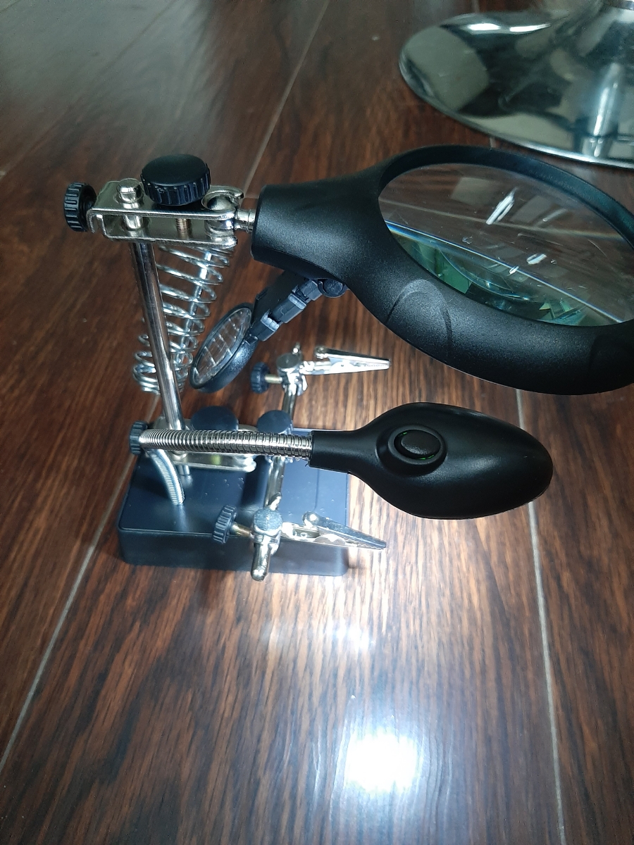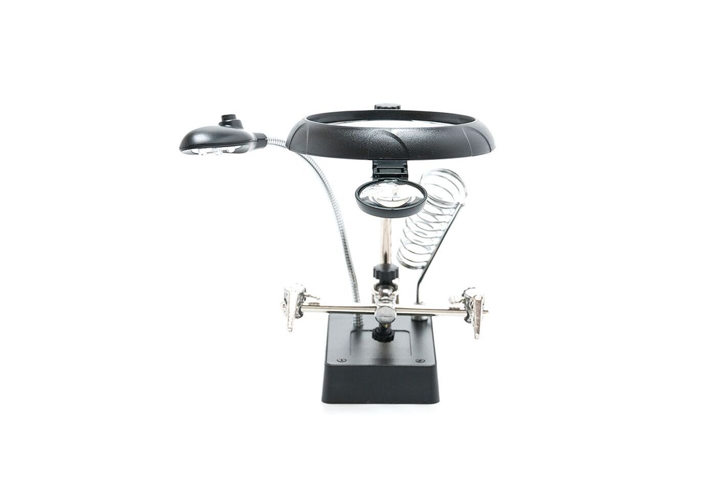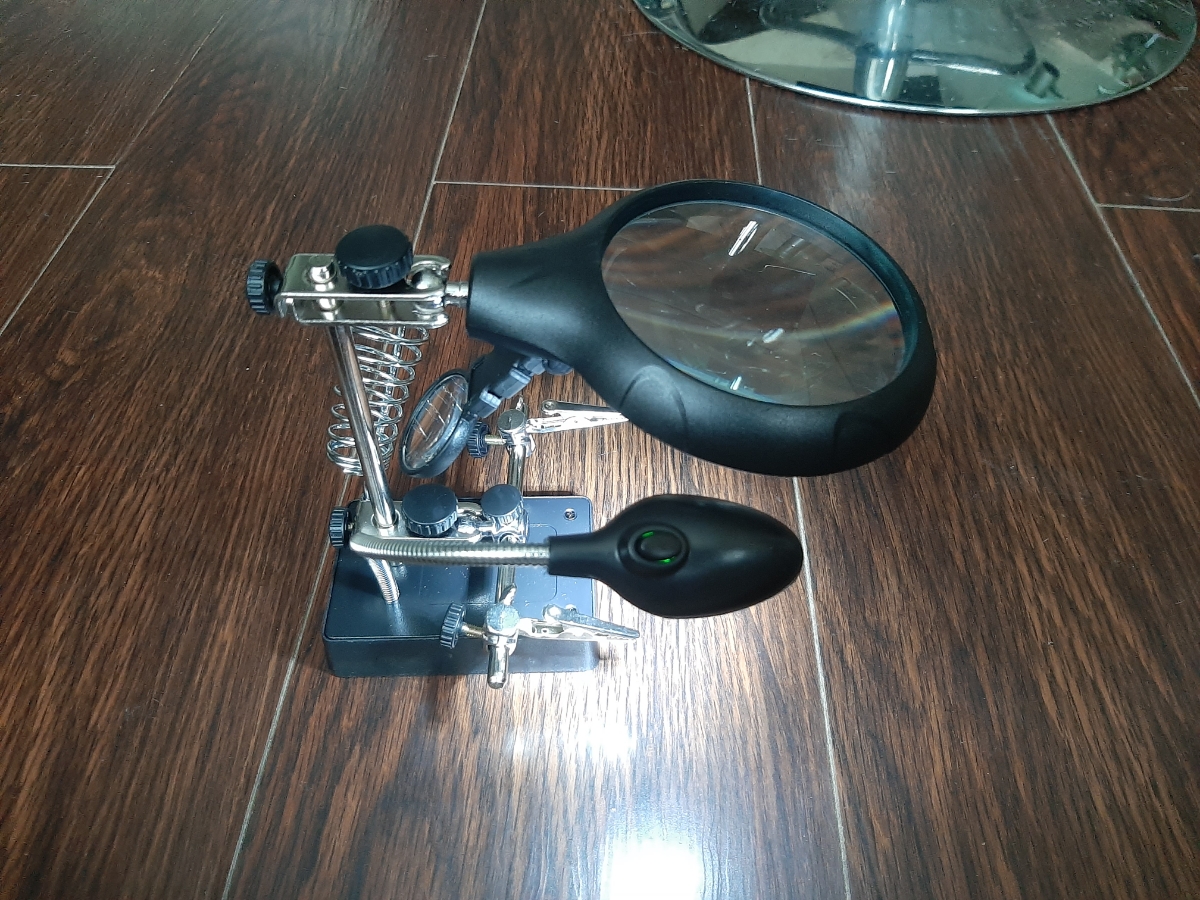 Удобный держатель для плат с лупой и светодиодной подсветкой.Оснащен устойчивым основанием с зажимами-крокодилами и подставкой под паяльник.Увеличение лупы: Ø90мм х 2,5Х Ø34мм х 7,5Х Ø34мм х 10ХПодсветка 5LED на гибком штативе, работает от сети 220В.