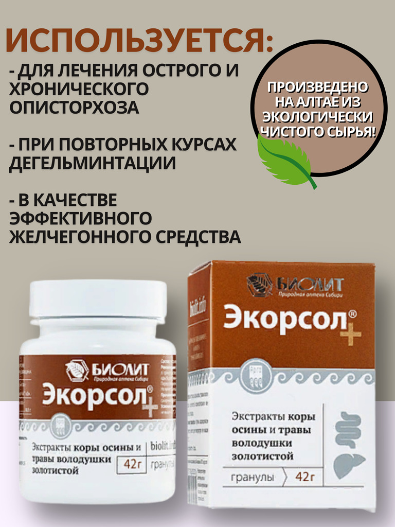 Экорсол+нормализует работу печени;улучшает функционирование желчевыводящих путей;оказывают противоописторхозный, желчегонный, противовоспалительный, гепатозащитный эффекты. Для профилактики и усиления эффекта медикаментозной терапии:острого и хронического
