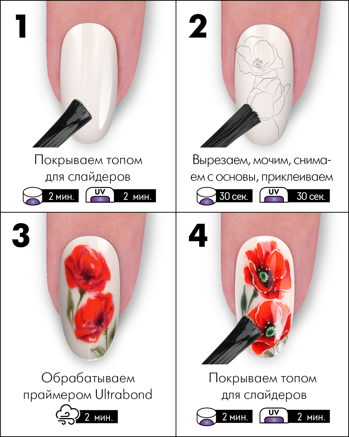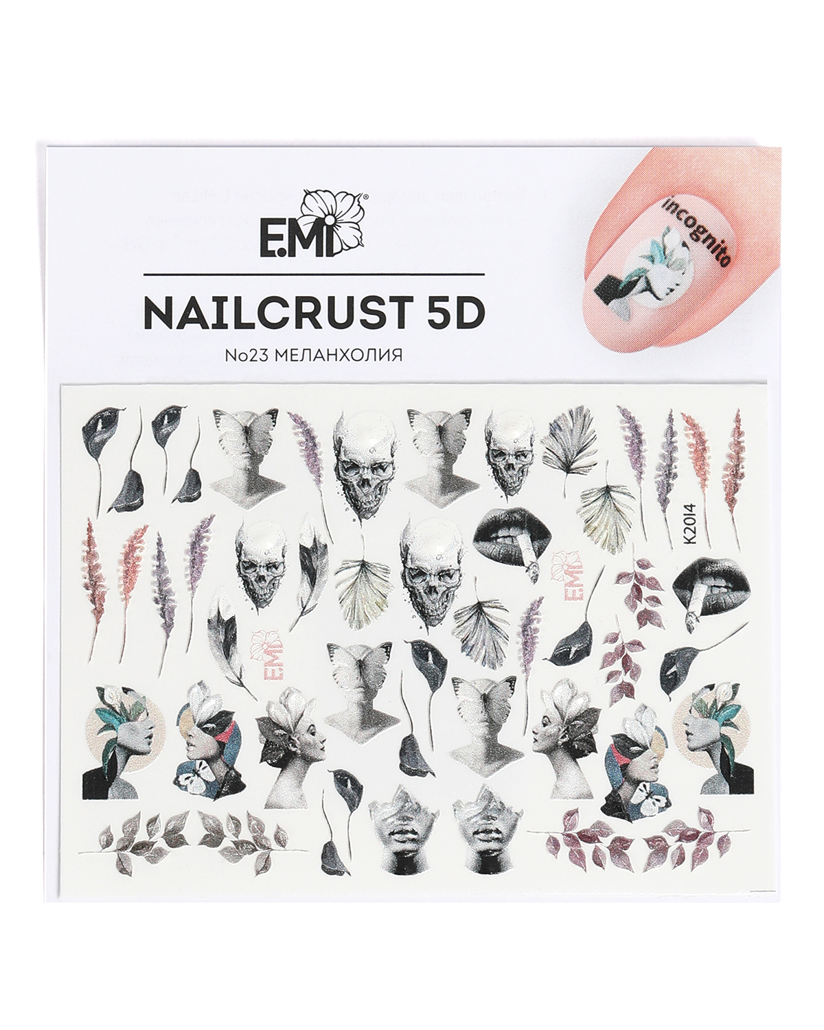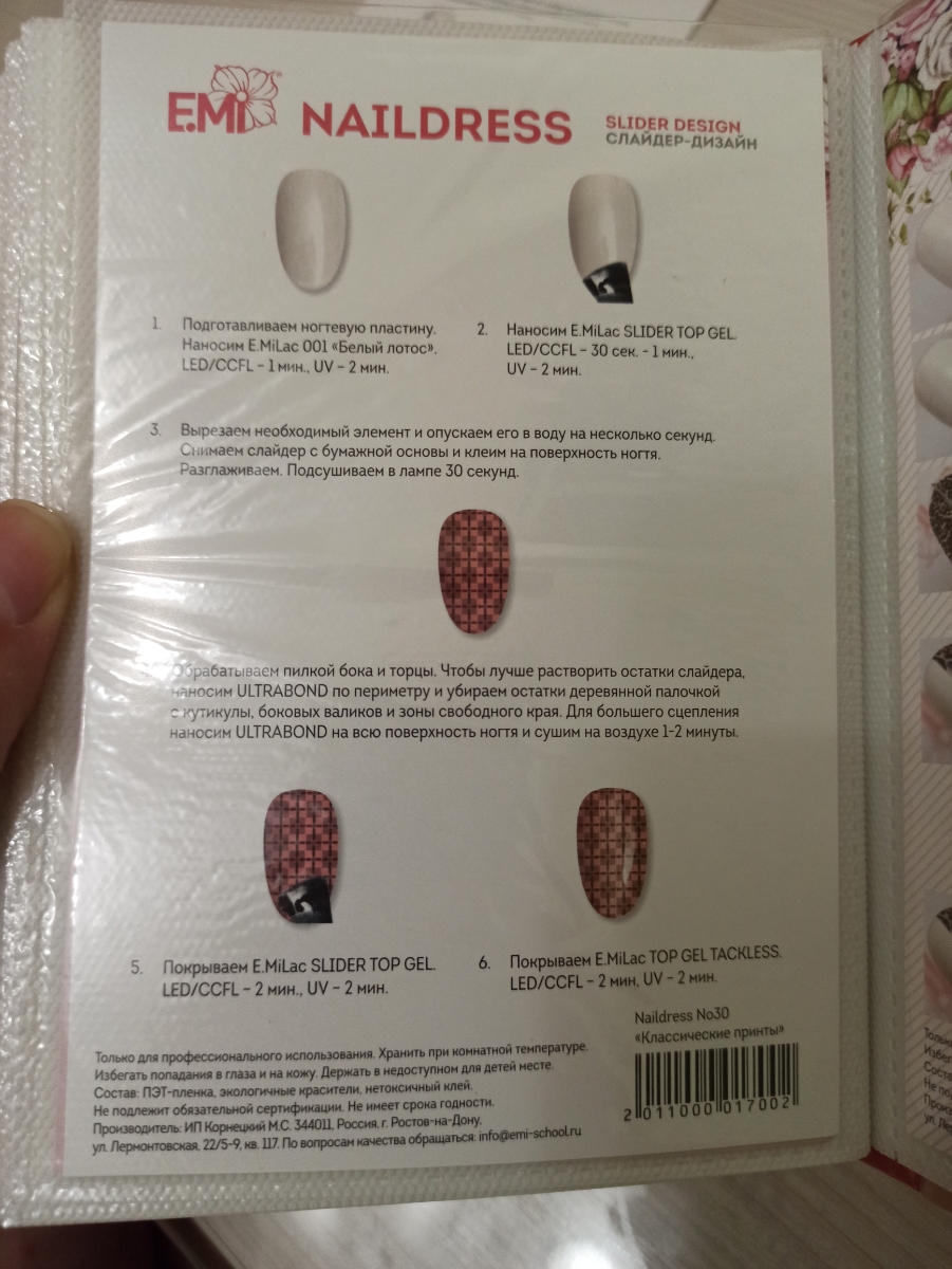Способ применения"Как применять? Выполнить маникюр, обезжирить поверхность. Нанести E.MiLac Ultra Strong Base Coat, просушить на воздухе. Выполнить покрытие цветным ультрастойким лаком E.MiLac Gel Effect в 1-2 слоя. Вырезать необходимый элемент NAILCRUST Трафареты-слайдер