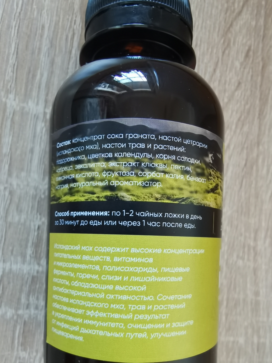 Состав:концентрат сока граната, настой цетрарии (исландского мха), настои трав и растений: подорожника, цветков календулы, корня солодки, чабреца, эвкалипта; экстракт клюквы, пектин, лимонная кислота, фруктоза, сорбат калия, бензоат натрия, натуральный ар