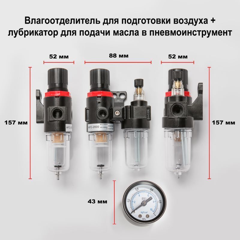Комплектация:фильтр влагоотделитель лубрикатор манометр Описание:европейский фильтр влагоотделитель с лубрикатором фирмы AFCфильтр влагоотделитель подготовит чистый воздух для покраски без примесей маслалубрикатор предназначен для авто подачи масла в пнев